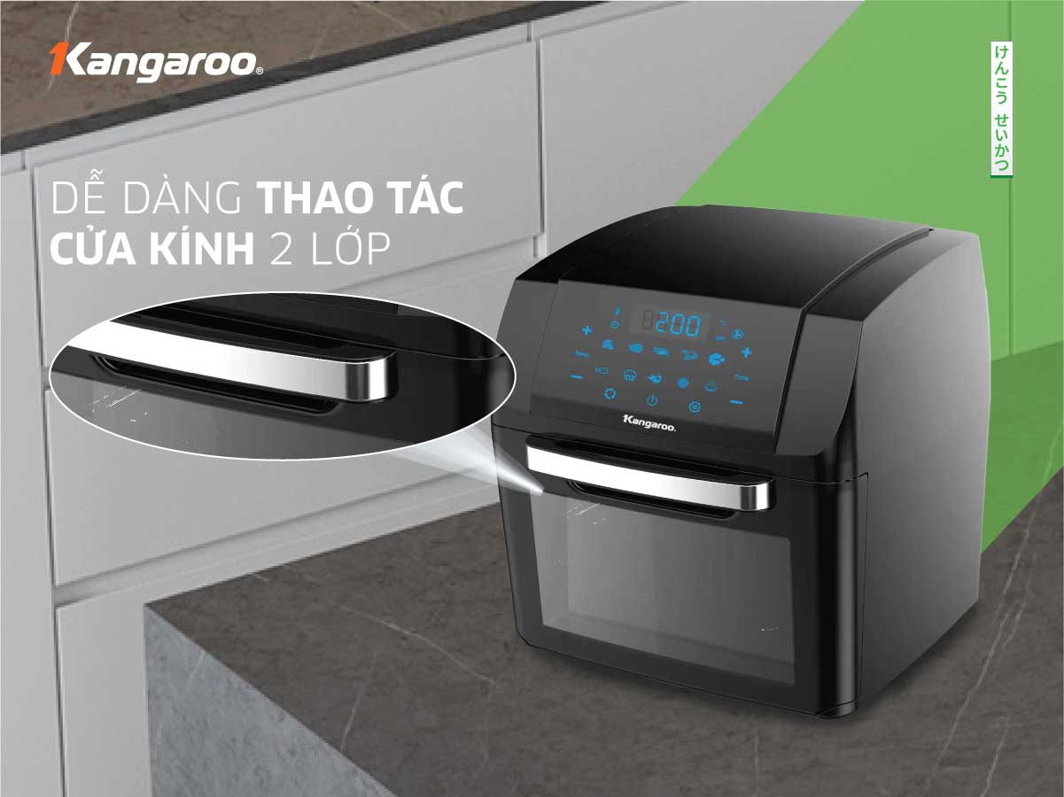 Lò chiên không dầu Kangaroo KG12AF5A được trang bị cửa kính thông minh 2 lớp chịu nhiệt dễ dàng quan sát quá trình chiên, nướng bên trong.
