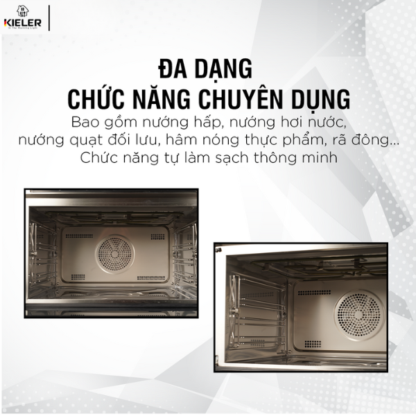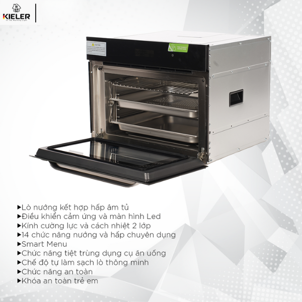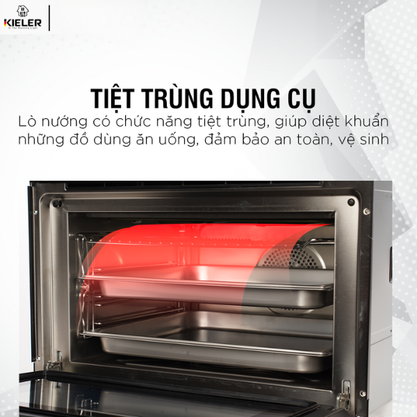 - Lò nướng Kieler còn có chức năng tiệt trùng dụng cụ ăn uống, chế độ tự làm sạch lò thông minh.