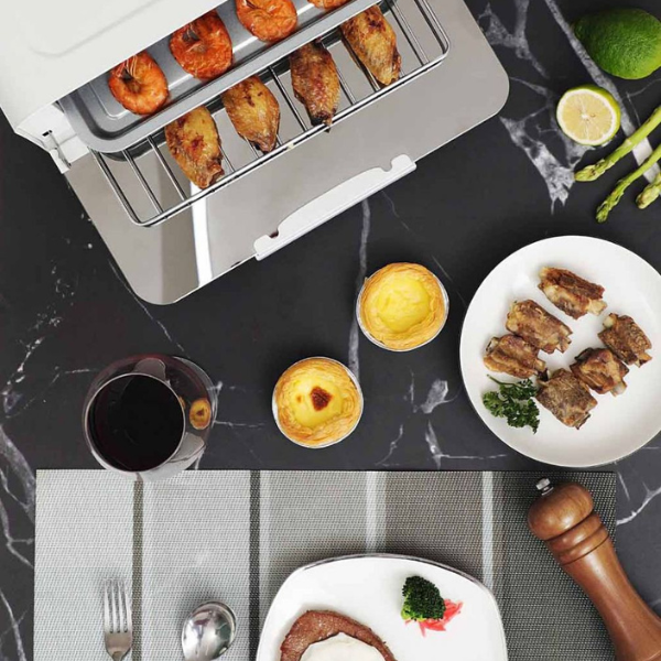 - Thiết kế ống gia nhiệt được làm bằng thép không gỉ hình chữ S hai lớp trên và dưới, sưởi ấm đồng đều và bền lâu. Trong quá trình sử dụng, có thể dễ dàng kiểm soát màu màu nướng của thực phẩm, giúp bạn nướng lớp da giòn tan và hương vị thơm ngon, mềm từ bên trong ra ngoài.