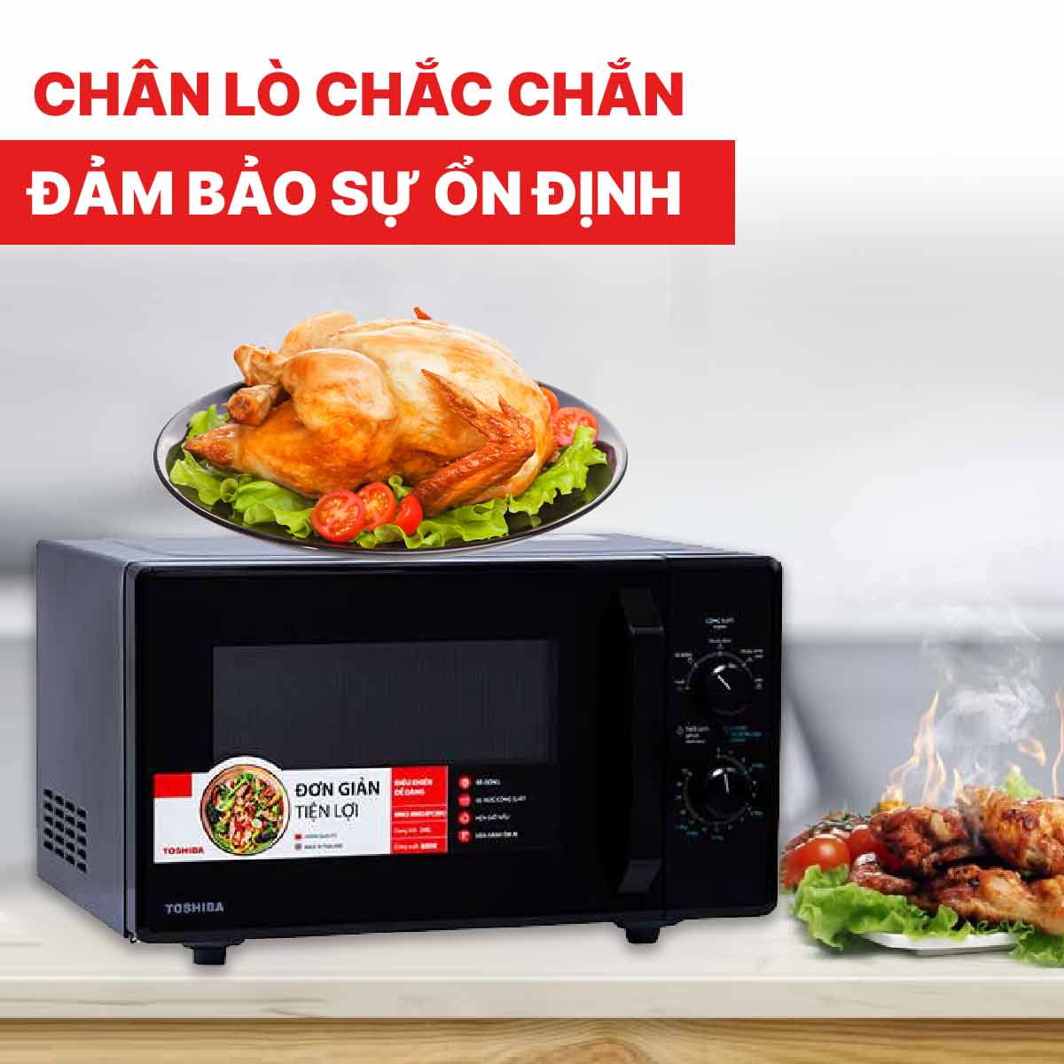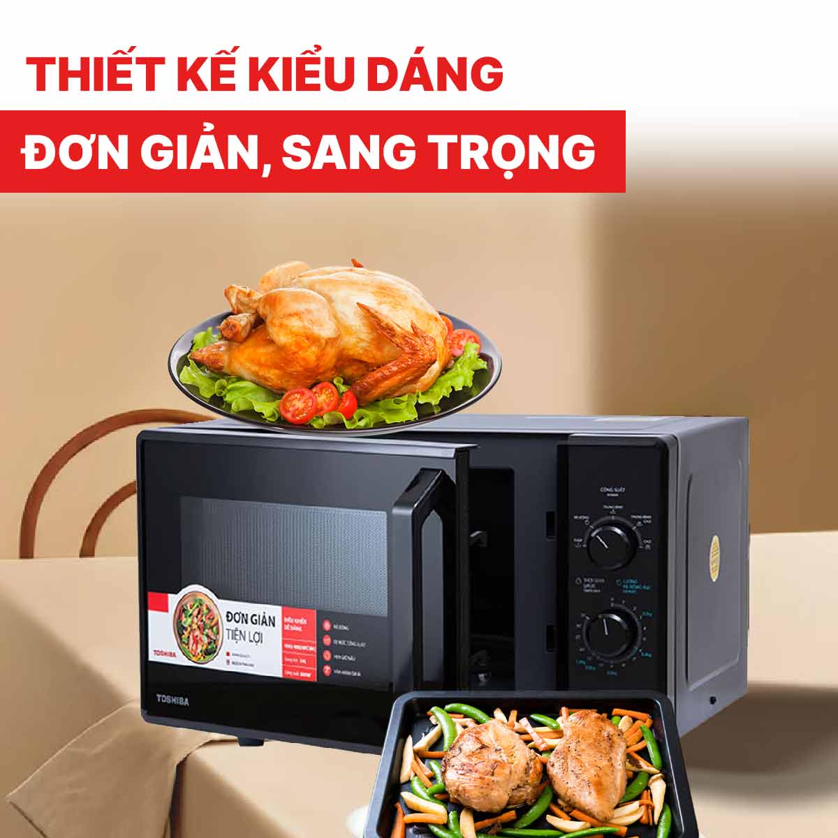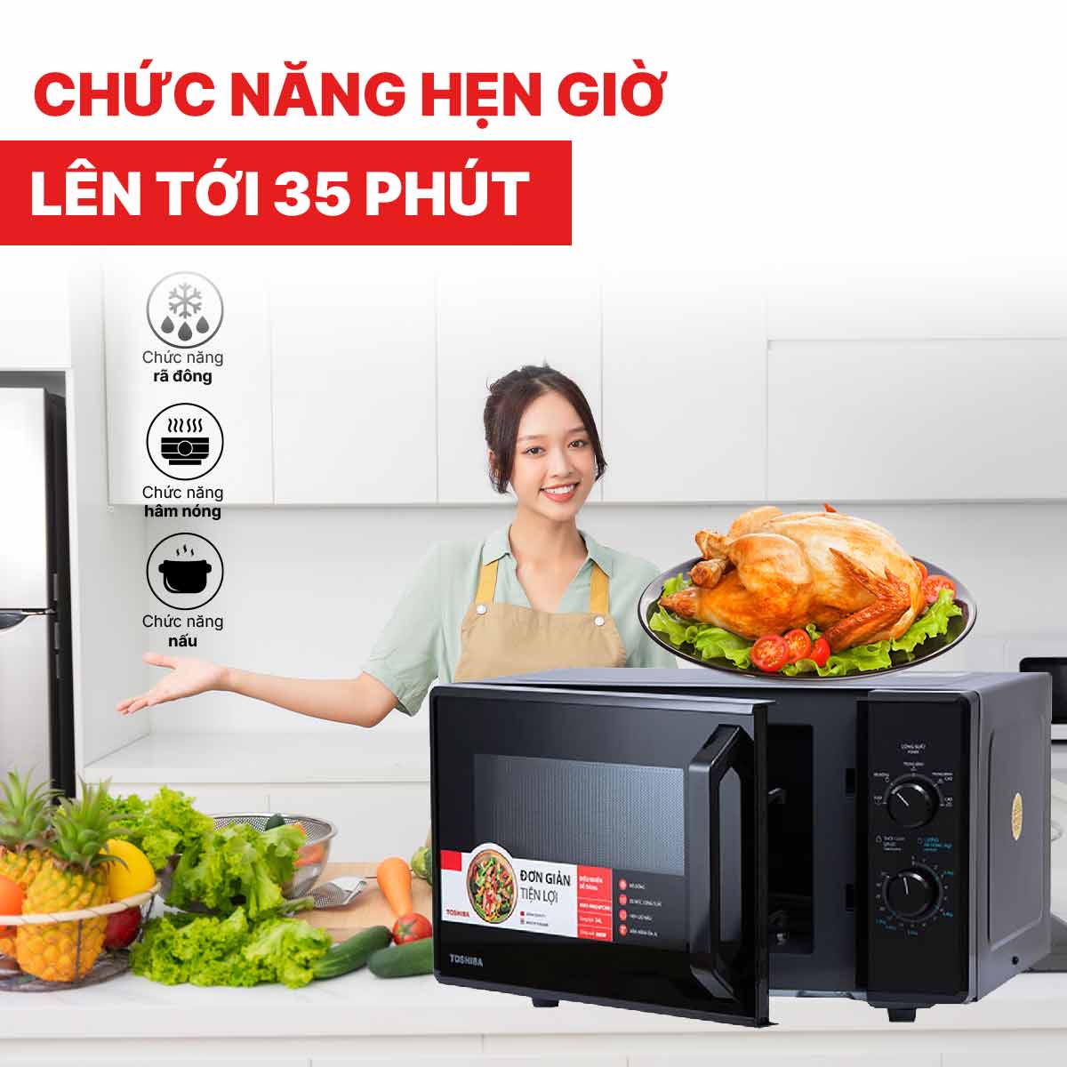 Toshiba MW2-MM24PC(BK) sở hữu dung tích 24 lít, đáp ứng nhu cầu sử dụng cho gia đình từ 3 đến 5 người. Công suất vi sóng 800W cùng 5 mức điều chỉnh linh hoạt cho phép người dùng dễ dàng hâm nóng, nấu nhanh hoặc rã đông thực phẩm. Chức năng rã đông giúp thực phẩm giữ được độ tươi ngon và hương vị nguyên bản sau khi chế biến. Sản phẩm hỗ trợ hẹn giờ tối đa 35 phút, mang lại sự chủ động và an toàn trong quá trình nấu nướng.