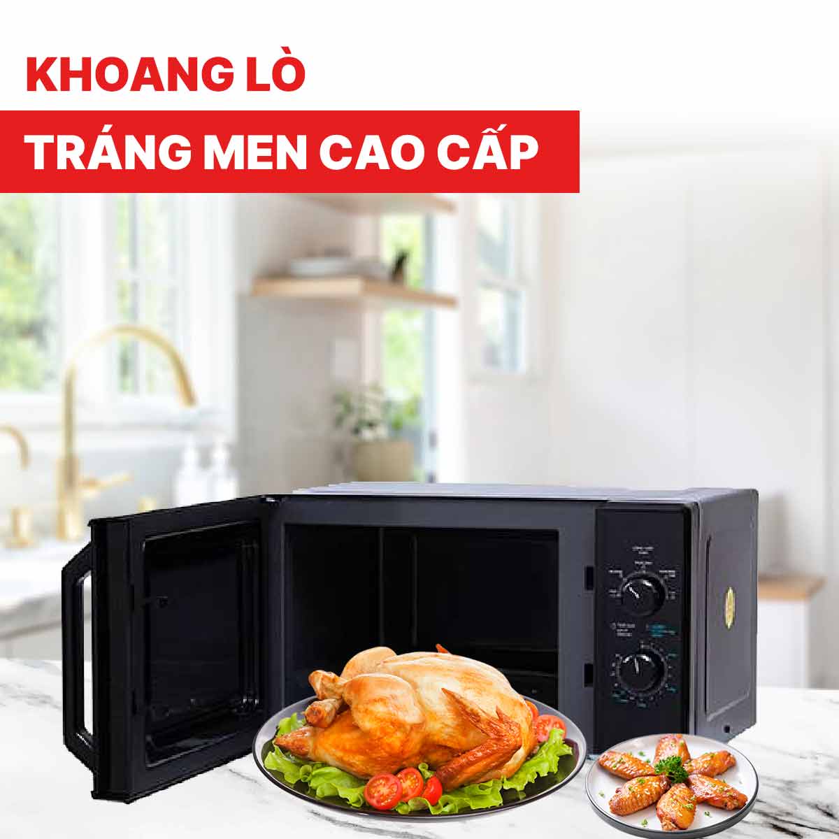 Đường kính đĩa xoay rộng 27cm đảm bảo thực phẩm được làm chín hoặc hâm nóng đều từ mọi phía. Hệ thống điều khiển bằng núm xoay cơ học đơn giản, dễ sử dụng và bền bỉ theo thời gian, đặc biệt phù hợp với cả người lớn tuổi. Kiểu dáng nhỏ gọn cùng tông màu đen hiện đại giúp lò vi sóng dễ dàng hài hòa với nhiều không gian bếp khác nhau.
