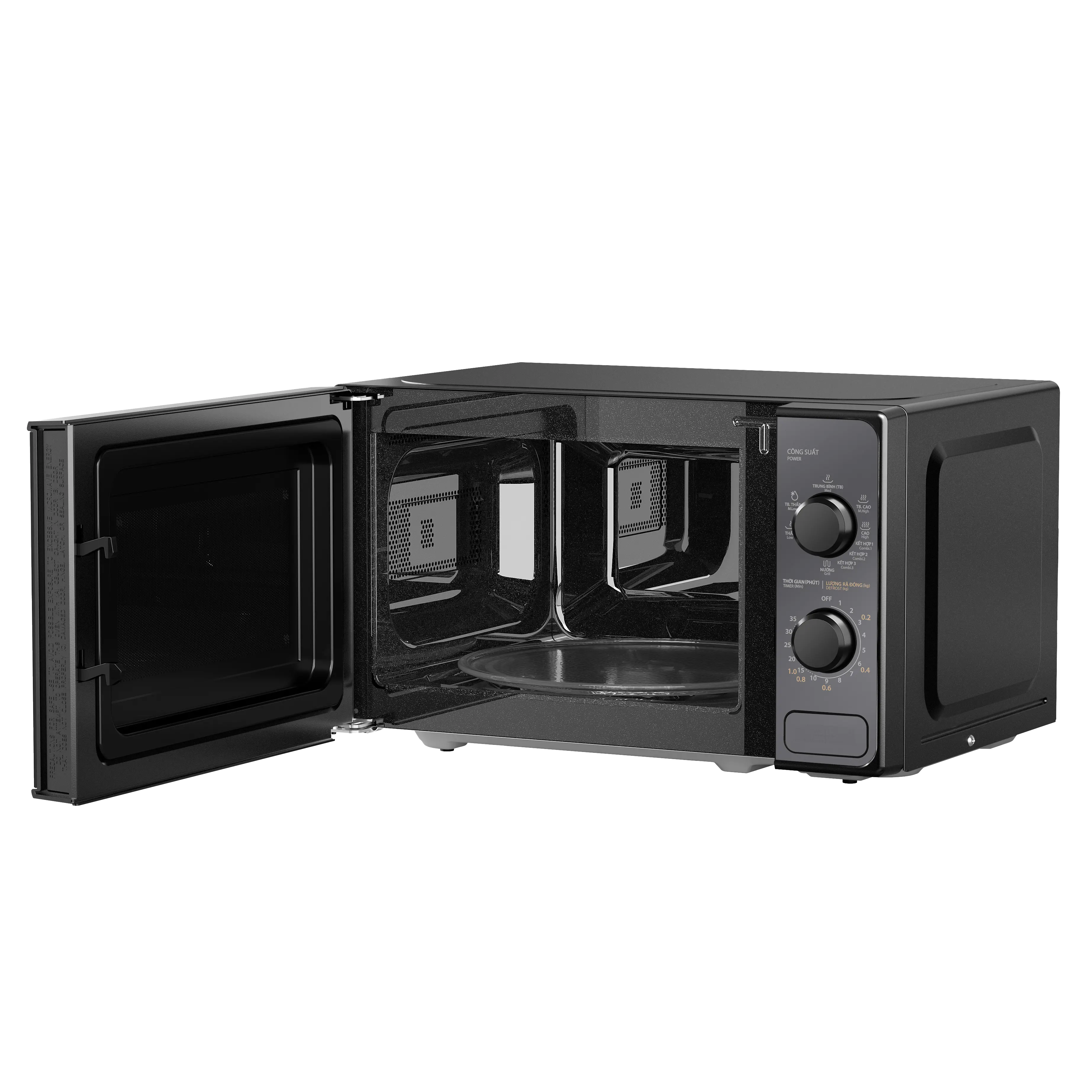 Khoang lò rộng rãi đi kèm đĩa xoay đường kính lớn, hỗ trợ phân bổ nhiệt đồng đều, giúp thực phẩm chín kỹ và giữ trọn hương vị. Chức năng rã đông theo thời gian hoặc khối lượng giúp tiết kiệm thời gian chuẩn bị, đảm bảo thịt cá mềm tự nhiên, không bị chín sớm ở viền. Hệ thống điều khiển cơ học bằng hai núm xoay bền bỉ và dễ sử dụng, phù hợp với nhiều đối tượng kể cả người lớn tuổi. Ngoài ra, chế độ hẹn giờ tối đa 35 phút giúp bạn chủ động kiểm soát quá trình nấu nướng, tránh tình trạng quá lửa hay cháy khét.