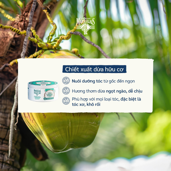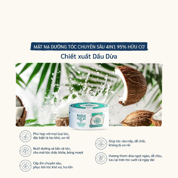 Mặt Nạ Tóc Le Petit Marseillais 4 Trong 1 Chiết Xuất Nước Dừa Hữu Cơ 300ml là sản phẩm chăm sóc tóc chuyên sâu đến từ Pháp, được thiết kế để nuôi dưỡng mái tóc từ gốc đến ngọn. Với công thức giàu dưỡng chất thiên nhiên, sản phẩm giúp khắc phục tình trạng tóc khô, xơ rối, mất nước và thiếu độ mềm mượt. Đây là giải pháp tiện lợi cho những ai muốn chăm sóc tóc hiệu quả mà không mất quá nhiều thời gian.