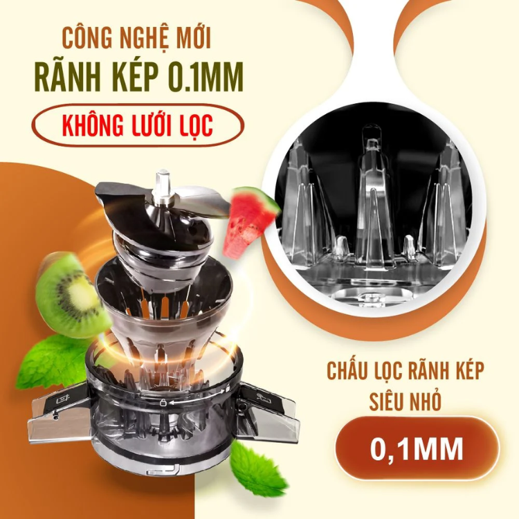 Ưu điểm: Ống nạp thực phẩm trực tiếp có đường kính lớn NHẤT hiện nay tới 103mm, SP duy NHẤT trên thị trường trang bị dao thái thô tự động trong ống nạp thực phẩm, Lỗ ép nhỏ NHẤT chỉ 0.1mm, kết cấu răng ép 360 độ không cần lưới kim loại đục lỗ truyền thống.