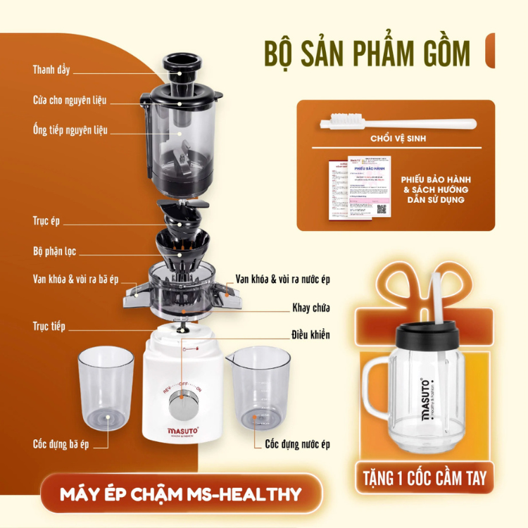 Các thành phần của máy ép chậm MS Healthy được thiết kế độc lập dễ dàng lắp ráp và tháo rời thuận tiện cho việc vệ sinh. Không chỉ vậy, máy cung cấp chổi vệ sinh riêng giúp loại bỏ bã hoa quả bám sâu trong cối ép, lưới lọc một cách nhanh chóng và dễ dàng.