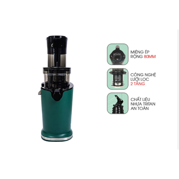 Cối ép miệng rộng được làm từ nhựa Tritan cao cấp, an toàn thực phẩm, chịu lực tốt, không bám mùi, dễ vệ sinh và bền bỉ theo thời gian. Lưỡi ép bằng inox cao cấp sắc bén, chống gỉ, cho khả năng ép hiệu quả, chiết xuất tối đa lượng nước từ nguyên liệu.