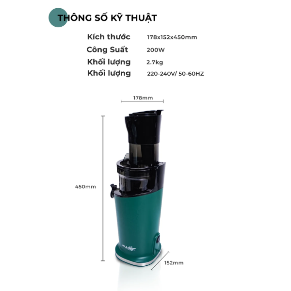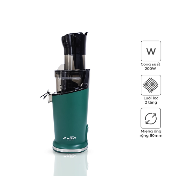 Máy ép chậm miệng rộng Magic Eco AC-134 là thiết bị lý tưởng cho các gia đình yêu thích nước ép tươi nguyên chất. Với công suất 200W và công nghệ ép lạnh Cold Press, máy chiết xuất tối đa vitamin, enzyme và hương vị tự nhiên từ trái cây và rau củ, giúp nước ép mịn, đồng đều và giữ trọn dưỡng chất.
