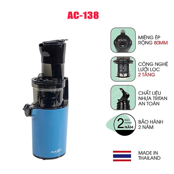 Máy ép chậm miệng rộng Magic Eco AC-138 là thiết bị lý tưởng cho gia đình yêu thích nước ép tươi nguyên chất. Máy sở hữu công suất 200W kết hợp công nghệ ép lạnh Cold Press giúp chiết xuất tối đa vitamin, enzyme và hương vị tự nhiên từ trái cây và rau củ. Nước ép mịn, giữ nguyên màu sắc, hương vị tự nhiên và dưỡng chất.