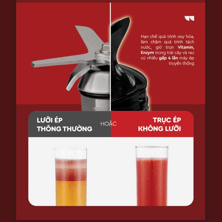 ✔️ Công nghệ ép lạnh hiện đại cùng tốc độ ép chậm hạn chế quá trình oxy hóa và làm chậm quá trình tách nước của nước ép, đồng thời giữ trọn vẹn hương vị, vitamin, enzym trong trái cây ️ Không gây tiếng ồn