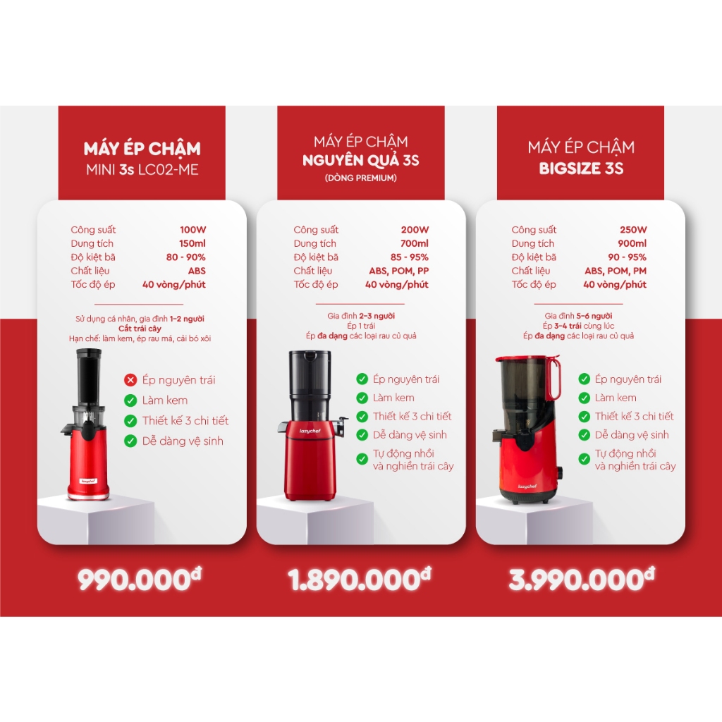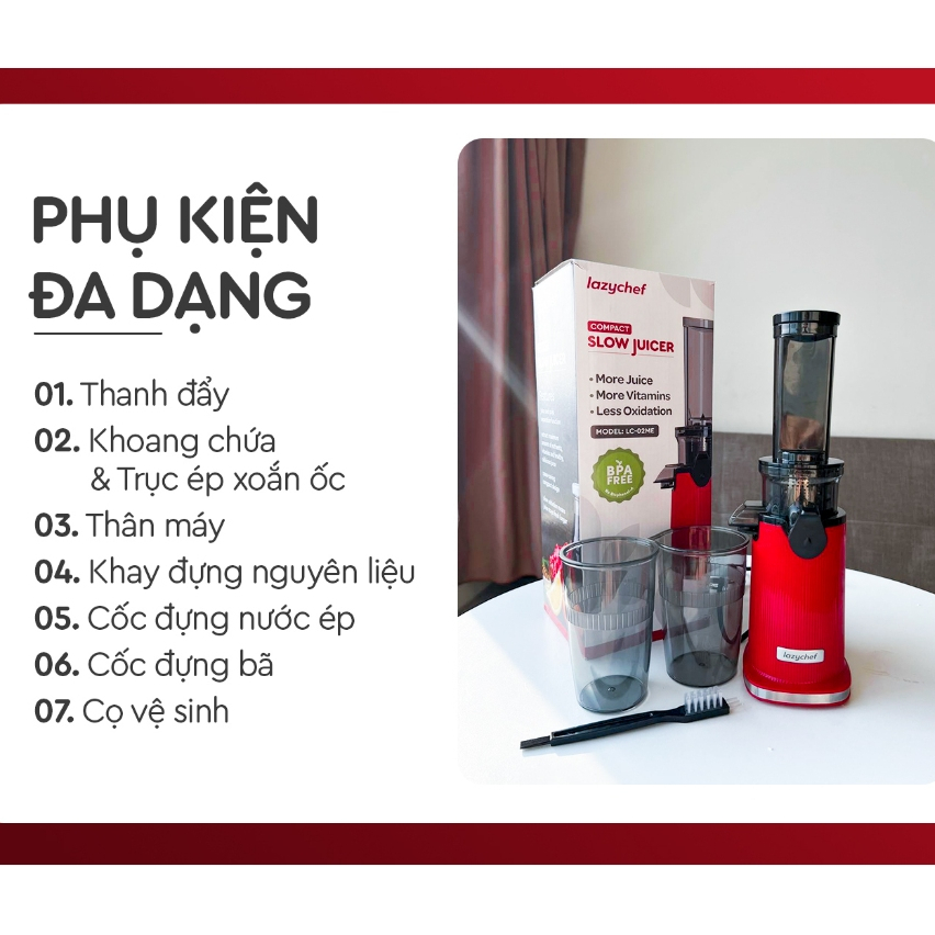 Máy ép chậm mini 3S Lazychef là sản phẩm gia dụng đa năng đến từ thương hiệu Lazychef Việt Nam. Vởi thiết kế nhỏ gọn vỏn vẹn 1kg, vòng xoay đảo chiều thông minh, dễ dàng lắp đặt và vệ sinh chỉ trong 3s. Máy ép chậm mini 3S đã chiếm được sự yêu thích và trở thành một sản phẩm máy ép chậm top 1 trong lòng người tiêu dùng.