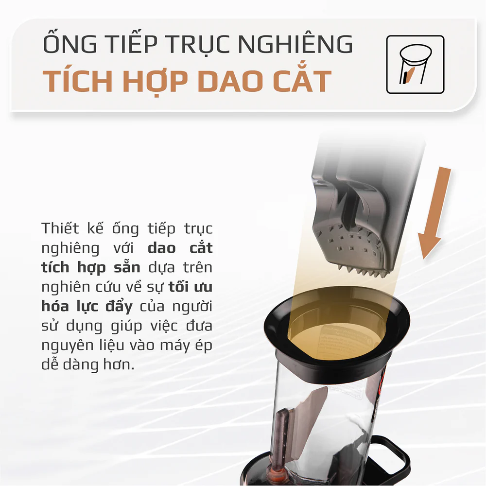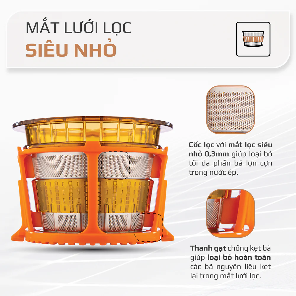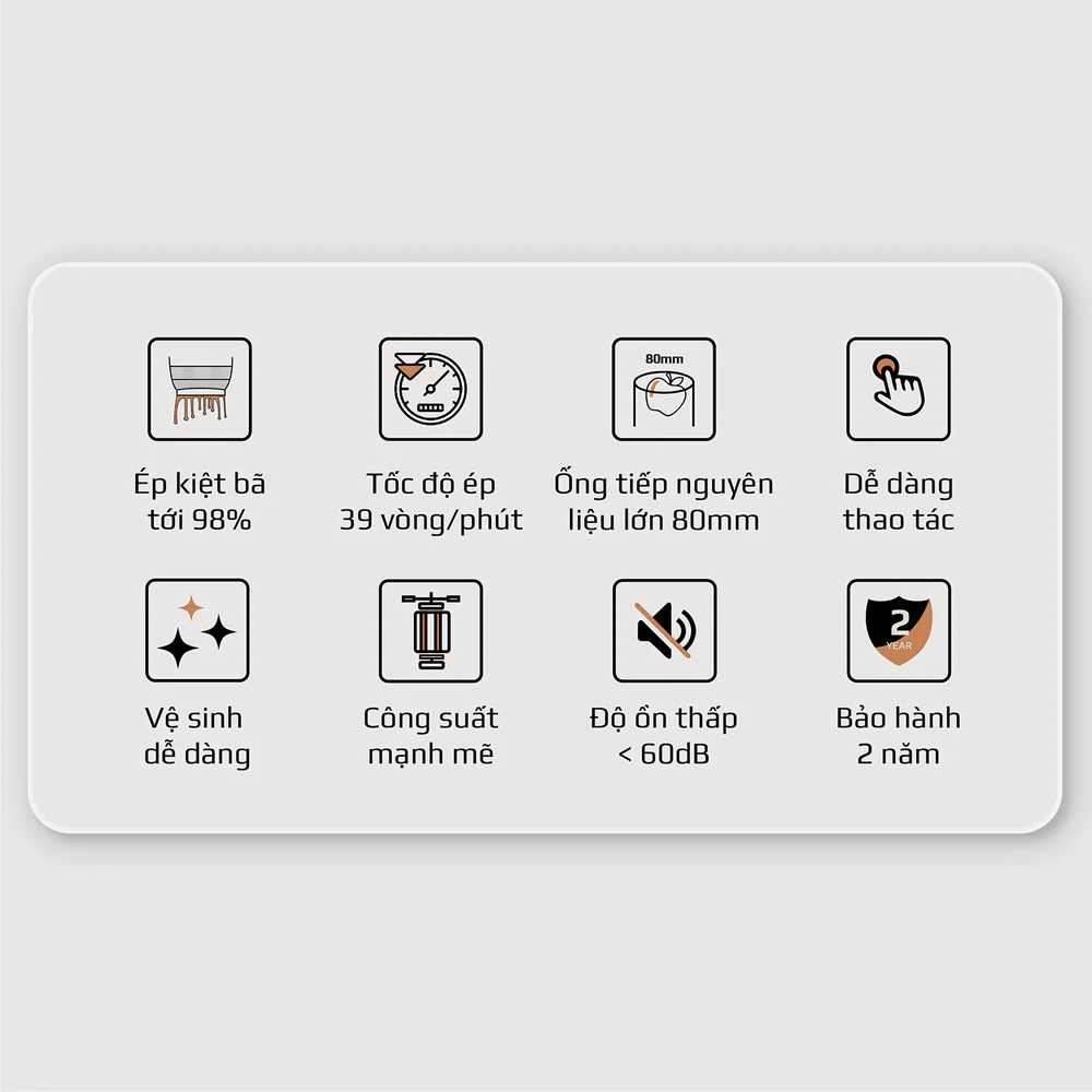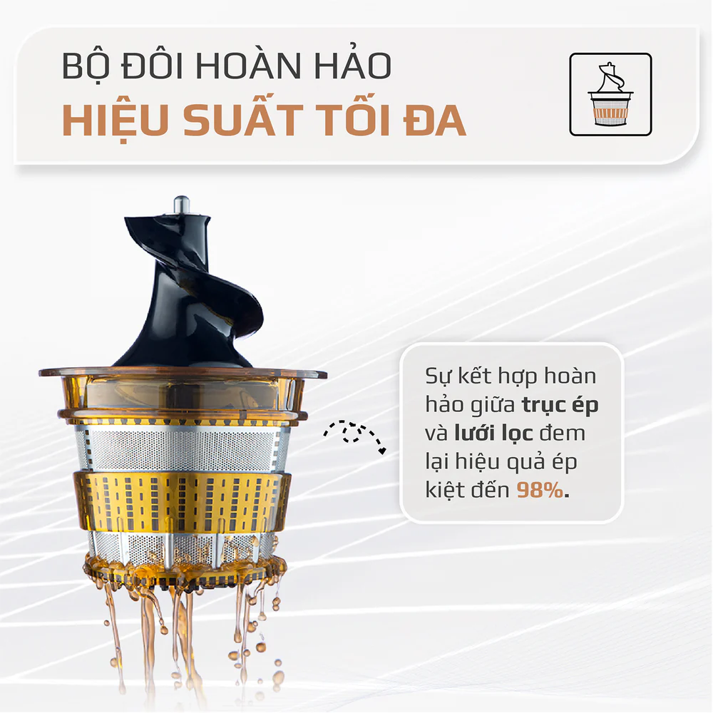 Công nghệ ép chậm hiện đại: Vận hành với tốc độ vòng quay thấp giúp giữ lại tối đa vitamin, enzyme và khoáng chất trong rau củ quả, mang đến ly nước ép nguyên chất, không phân tầng, ít bọt.