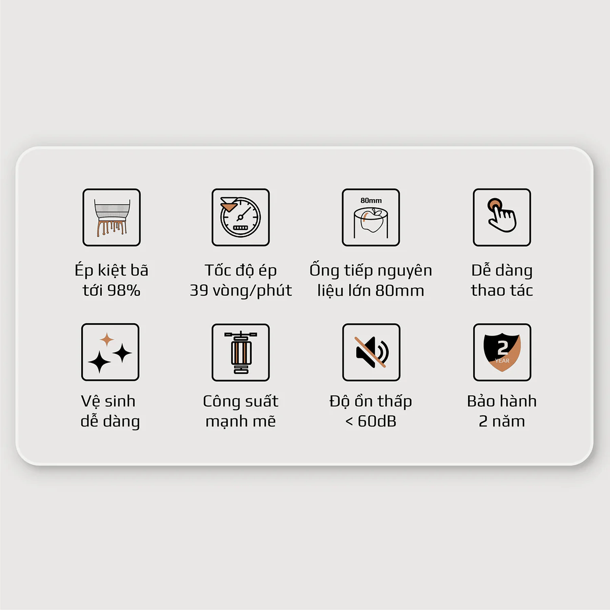 - Tiết kiệm & bền bỉ: Lượng nước ép thu được nhiều hơn, bã khô hơn so với máy ép nhanh truyền thống, giúp tiết kiệm nguyên liệu và chi phí.OLIVO SJ200 chính là trợ thủ hoàn hảo để bạn và gia đình thưởng thức những ly nước ép tươi ngon – bổ dưỡng – an toàn mỗi ngày.