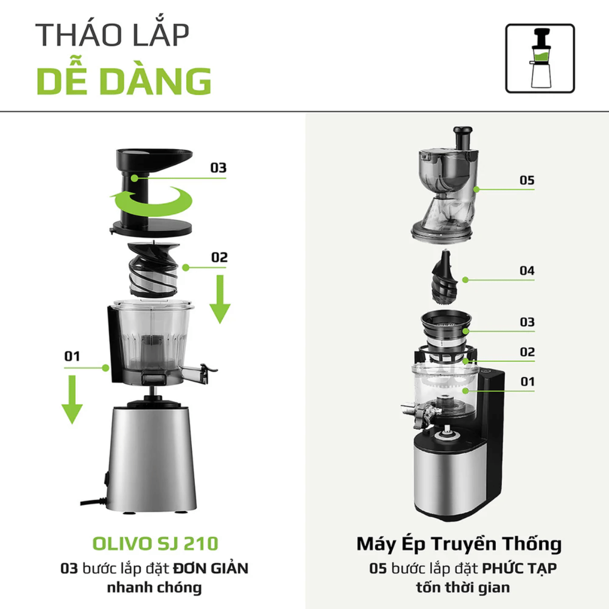 Máy ép chậm OLIVO SJ 210 có thiết kế hiện đại với vỏ nhôm cao cấp, đơn giản và nhỏ gọn. Máy có màu sắc bắt mắt và sang trọng. Máy cực kỳ dễ dàng lắp đặt, chỉ với 3 bước đơn giản là sử dụng được. Bạn sẽ không mất quá nhiều thời gian ở khâu này như các máy ép khác trên thị trường. Điều này vừa giúp máy có chất lượng tốt, độ bền cao mà còn dễ dàng vệ sinh máy sau khi sử dụng.