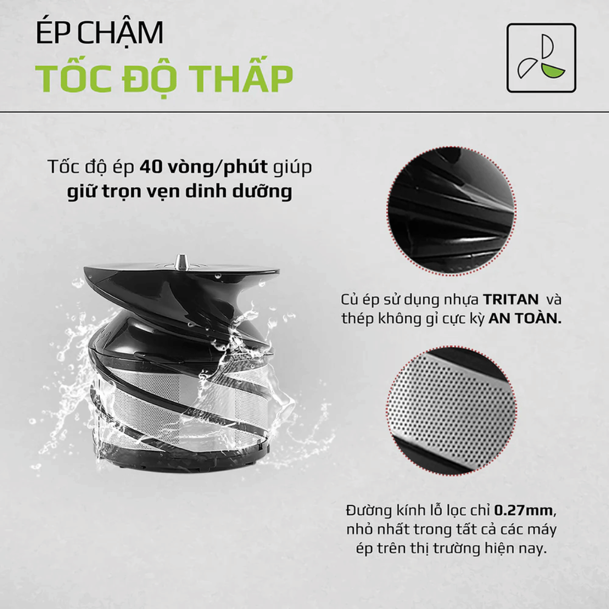 - Máy ép được trang bị bộ lưới lọc kép vì thế mà máy ép kiệt bã và chắt được lượng nước tối đa có trong rau củ quả. Với đường kính lỗ lọc chỉ có 0.27 mm, khi uống nước ép sẽ không thấy bị lợn cợn. Lỗ lọc nhỏ nhất trong tất cả các máy ép hiện nay có trên thị trường. Ống tiếp nguyên liệu được thiết kế dạng phễu, giúp đưa nguyên liệu vào trong một cách dễ dàng mà không bị rơi ra ngoài.
