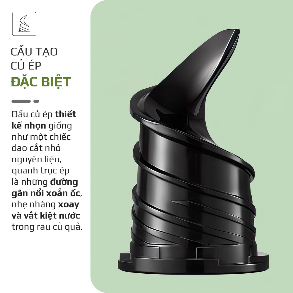Công nghệ ép chậm hiện đại: Tốc độ quay thấp (~55 vòng/phút) giúp nước ép giữ nguyên hương vị tự nhiên, vitamin, enzyme và khoáng chất.