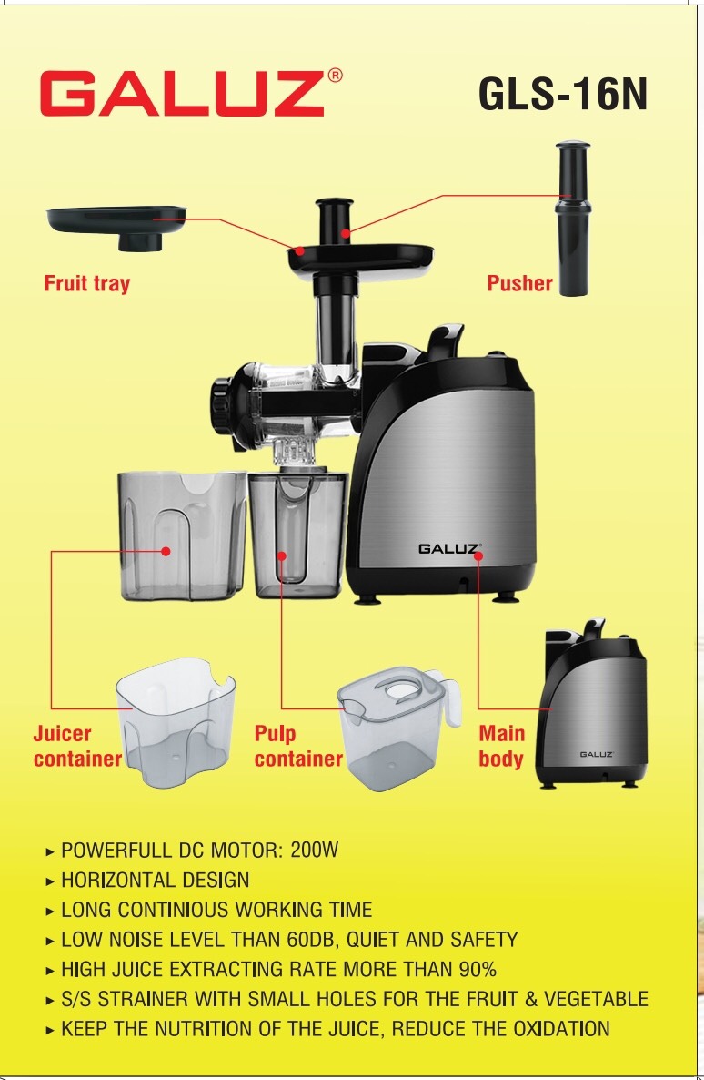 Trong quá trình ép, máy Galuz GLS-16N gần như không tạo ra lực ly tâm và ma sát, giúp giữ lại lượng vitamin trong hoa quả cao gấp 6 lần, lượng nước ép tăng gấp đôi và lượng bã chỉ bằng 1/3 so với các máy ép thông thường, nước ép cũng không bị tách nước và không tạo bọt.