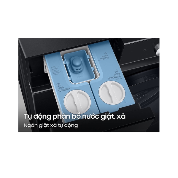 - Ngăn chứa nước giặt xả AI Dispenser: Với 1 lần đổ vào ngăn chứa, máy giặt có thể tự động cân chỉnh nước giặt xả sử dụng lên đến 1 tháng (nếu giặt máy khoảng 4 lần/tuần). Việc cân chỉnh lượng nước giặt xả được tiến hành chính xác sao cho phù hợp với độ bẩn và khối lượng quần áo trong suốt quá trình giặt.