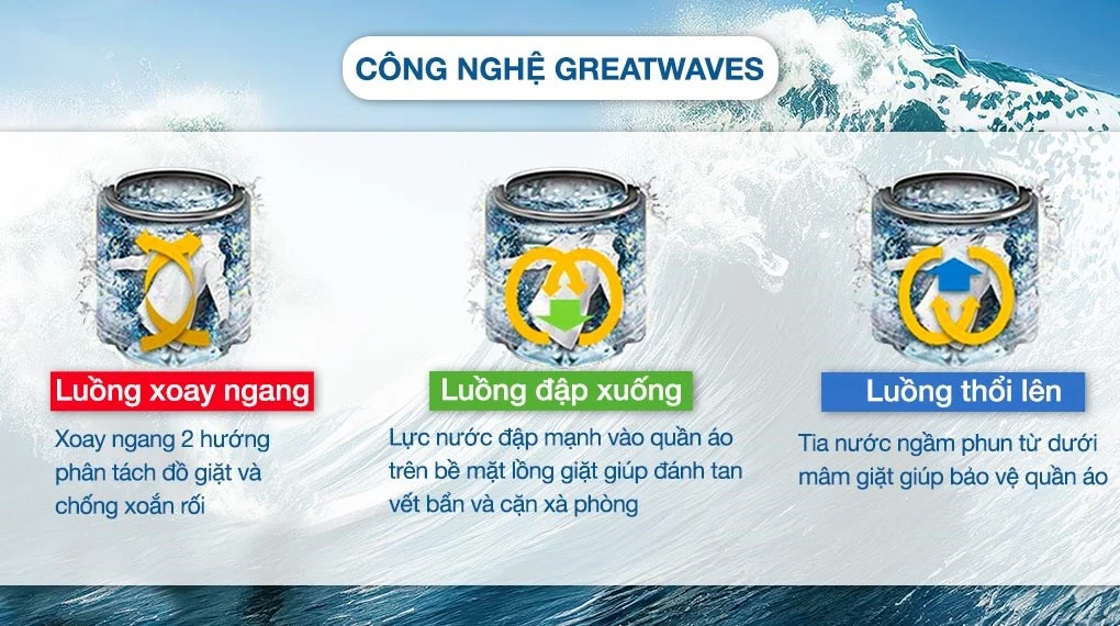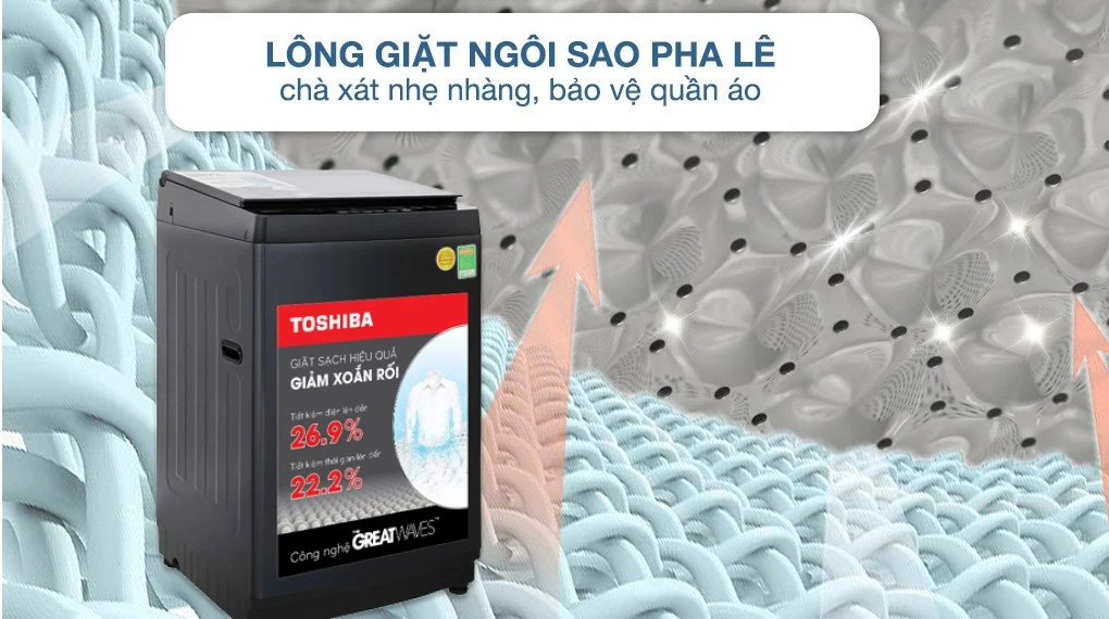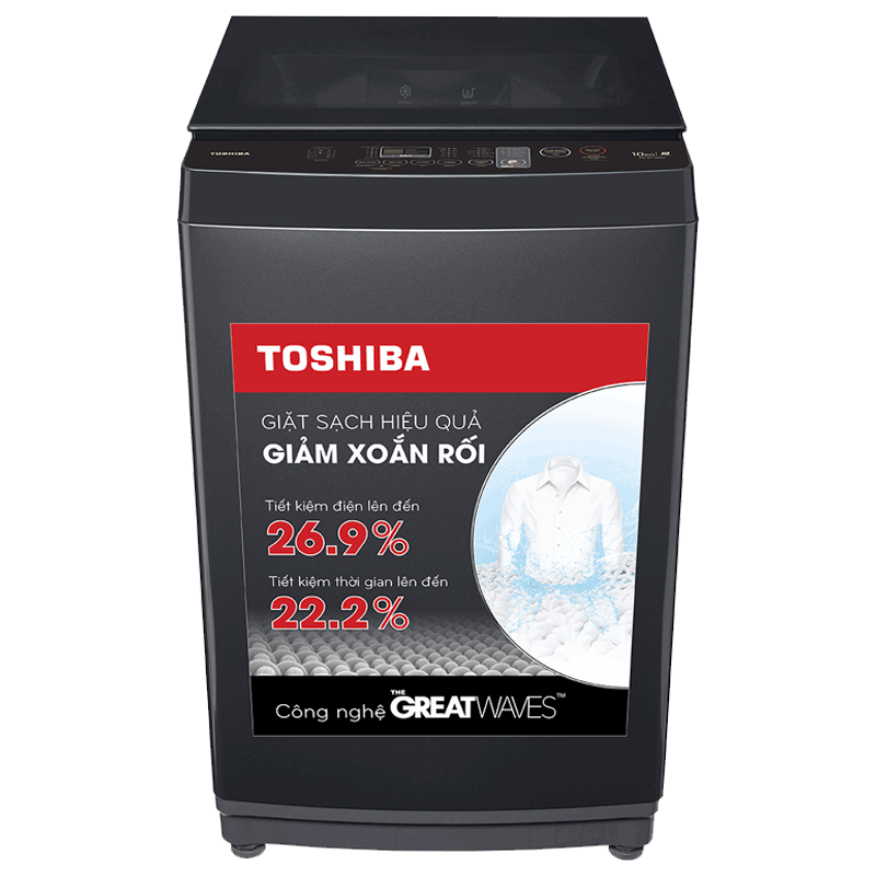 - Công nghệ giặt siêu sóng Greatwaves: với sự kết hợp 3 luồng nước cùng các tia nước tạo ra từ lỗ phun của máy giặt Toshiba, thiết bị kiến tạo luồng nước siêu mạnh giúp phân tách quần áo, chống xoắn rối, loại bỏ vết bẩn, cặn xà phòng, giúp giặt sạch và bảo vệ chất liệu vải.