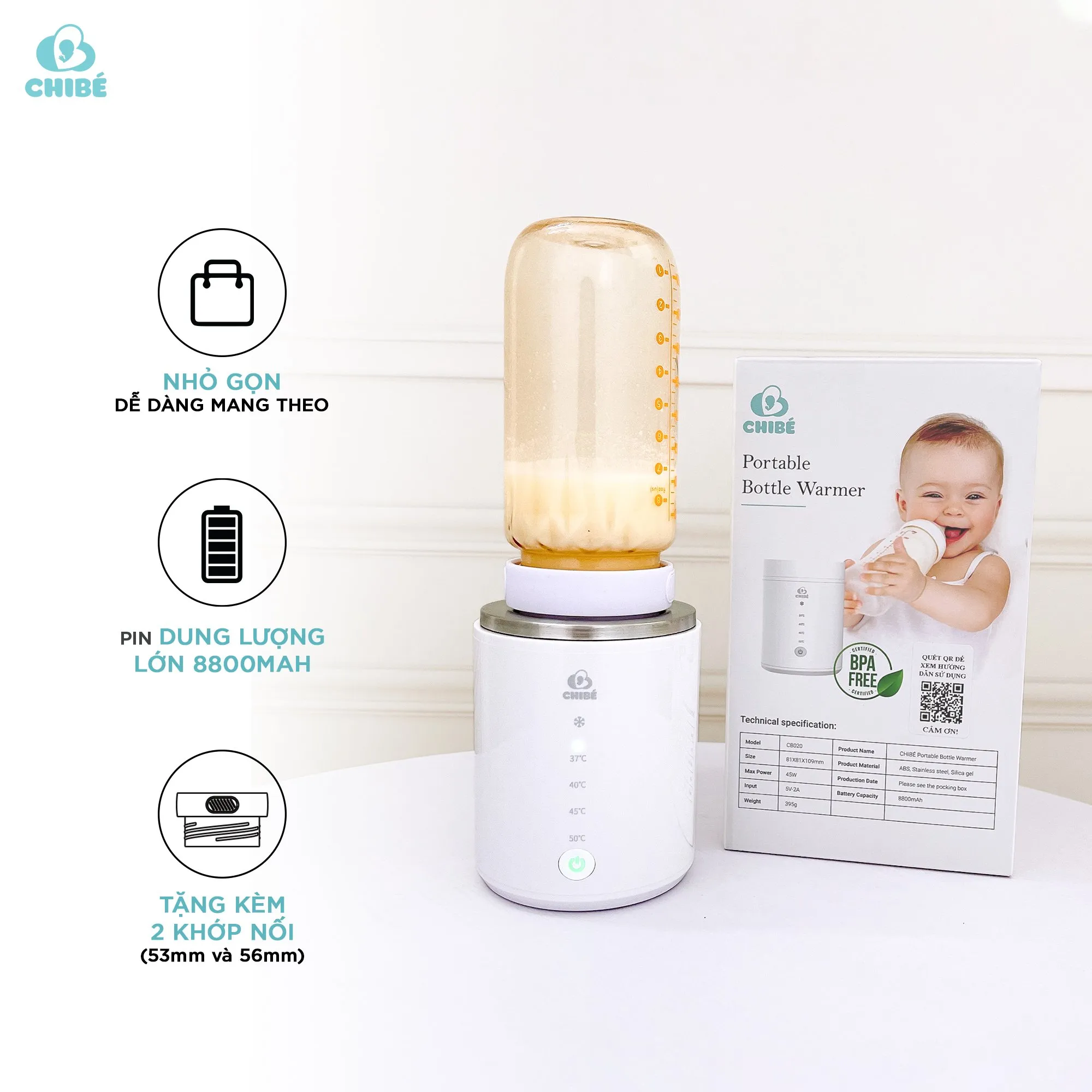 MÁY HÂM SỮA DI ĐỘNG CHIBÉ - Tự động rã đông, làm ấm nhanh chóng tiết kiệm thời gian hâm sữa Máy Hâm sữa cầm tay công nghệ cao của CHIBÉ là lựa chọn hoàn hảo cho mỗi lần ba mẹ đưa bé đi tiêm, du lịch, về quê thăm ông bà, hay cả khi cả gia đình đang di chuyển trên ô tô. Chỉ với một chiếc máy nhỏ gọn, ba mẹ có thể yên tâm chuẩn bị sữa cho bé ở bất cứ đâu, bất cứ lúc nào. HÂM SỮA 4 MỨC NHIỆT ĐỘ NHANH CHÓNG Máy hâm sữa ở 4 mức nhiệt 37, 40, 45, 50 độ C, công nghệ mới tỏa đều nhiệt nhanh hơn và giúp giữa toàn bộ chất dinh dưỡng trong sữa CHẾ ĐỘ RÃ ĐÔNG SỮA TỰ ĐỘNG Khi sữa lấy từ tủ lạnh có mức nhiệt dưới 20 độ, Máy sẽ tự động bật chế độ rã đông và làm ấm lên 37 độ sau khi kết thúc rã đông CHẤT LIỆU MÂM TỎA NHIỆT AN TOÀN Mâm thép không gỉ, chất liệu nhựa không chứa BPA đạt chuẩn an toàn thực phẩm, đảm bảo sữa cho bé ăn NHỎ GỌN, TIỆN LỢI MANG THEO Máy có kích cỡ như một chiếc cốc xinh xắn, phù hợp đặt vào balo mang theo hay để ở hộc ô tô siêu tiện lợi DUNG TÍCH PIN LỚN Pin lithium 8800mAh, không cần cắm dây khi sử dụng rất tiện lợi cho ba mẹ cầm theo khi đi du lịch, đi dạo với bé, sử dụng dây sạc usb - type C dễ dàng thay thế nếu ba mẹ quên sạc ở nhà PHÙ HỢP VỚI NHIỀU LOẠI BÌNH Máy vừa với bình sữa có kích thước cổ 50mm. Tặng kèm 2 cổ nối 53mm và 56mm, phù hợp nhiều loại bình sữa thông dụng ba mẹ dùng hiện nay Thông tin chi tiết: +Kích thước: 81*81*109mm +Kích thước miệng mình sữa: 50mm +Tặng kèm: 2 khớp nối: 53mm và 56mm (nên sử dụng bình thủy tinh qua khớp nối) +Công suất: 45W +Nguồn sạc: 5V/2A +Dung lượng pin: 8800 mAh +Trọng lượng: 395g +Bảo hành KIM CƯƠNG 12 tháng Bảo bối để ba mẹ luôn có sữa ấm ở mọi nơi đó ạ! Sắm ngay thôi ba mẹ ơi!