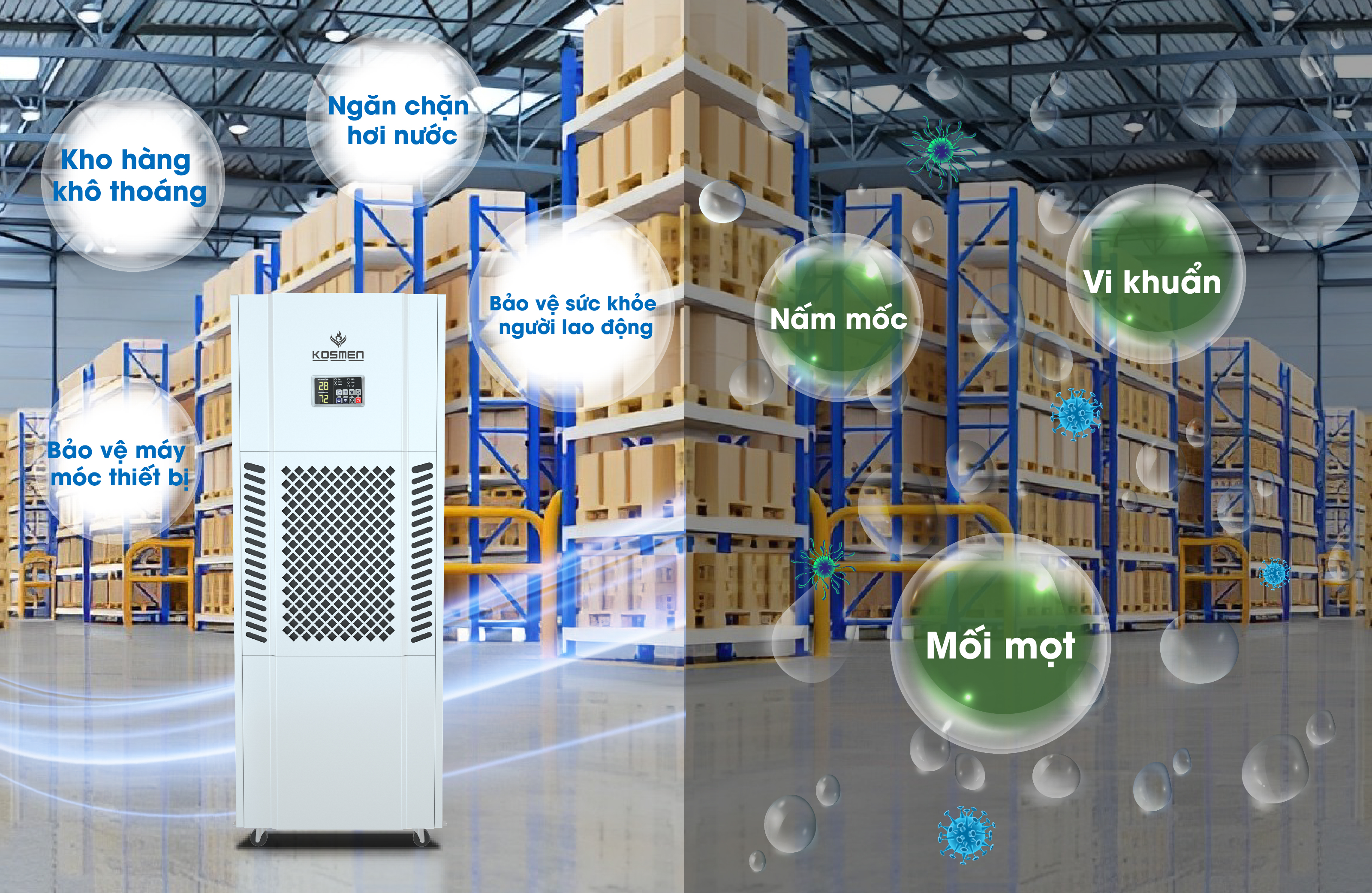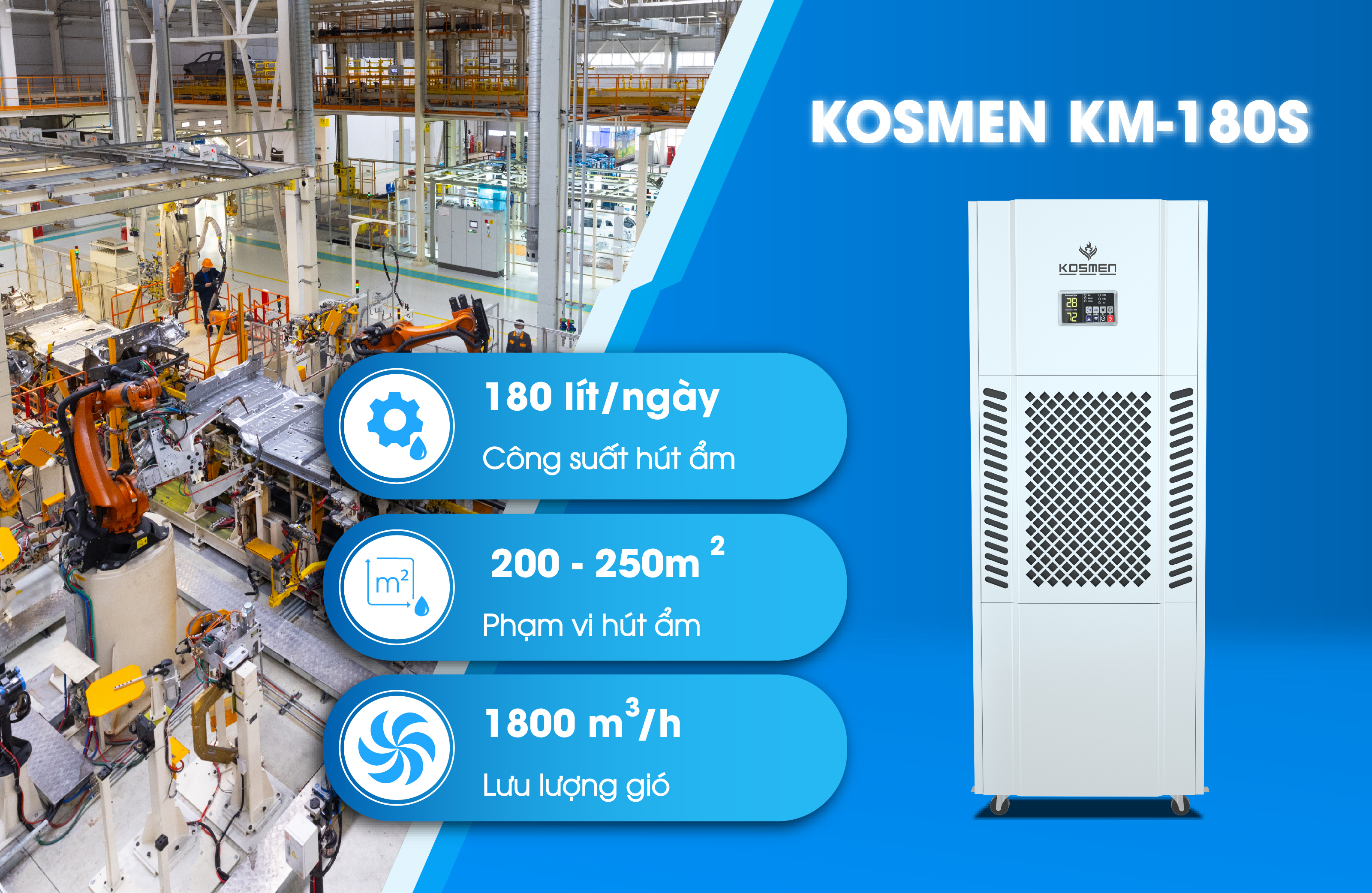 Máy hút ẩm công suất lớn Kosmen KM-180S kiểm soát chặt chẽ độ ẩm, bảo quản thiết bị sản xuất