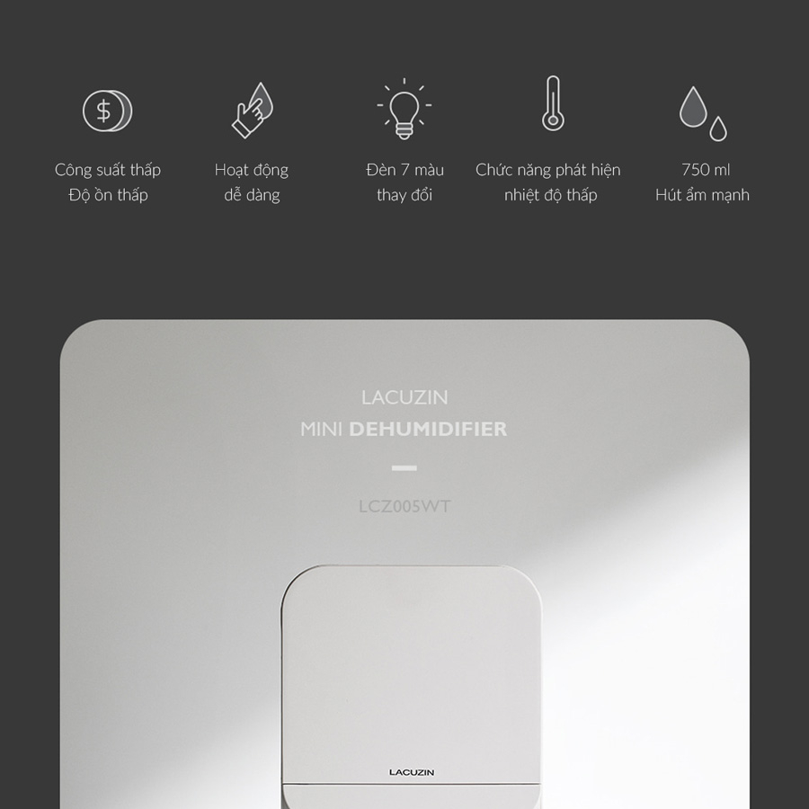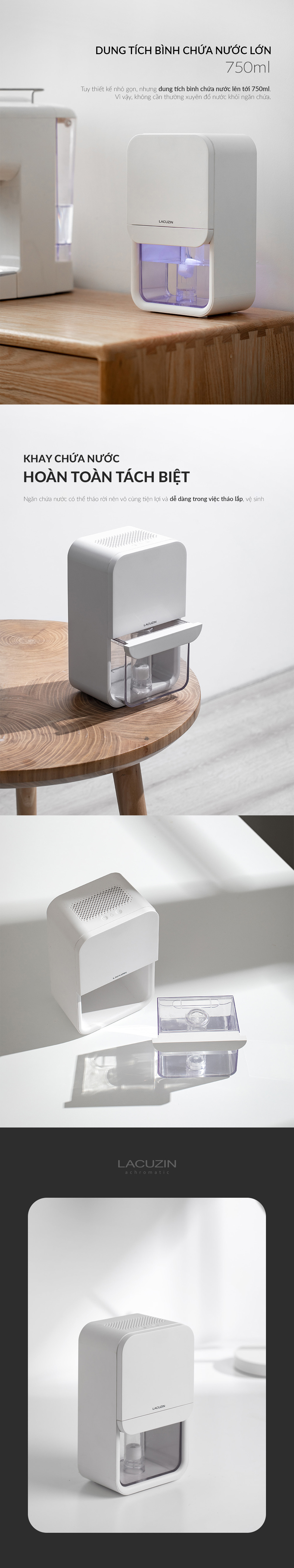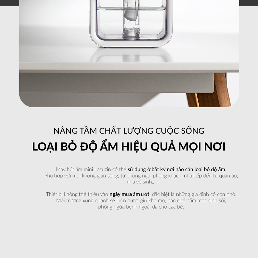 MÁY HÚT ẨM MINI CỦA LACUZIN sẽ giải quyết mọi vấn đề. Giữ ngôi nhà của bạn khô ráo và thoải mái suốt 4 mùa, loại bỏ độ ẩm ở bất kỳ căn phòng nào, từ phòng ngủ, phòng khách, nhà bếp cho đến tủ quần áo, nhà vệ sinh...