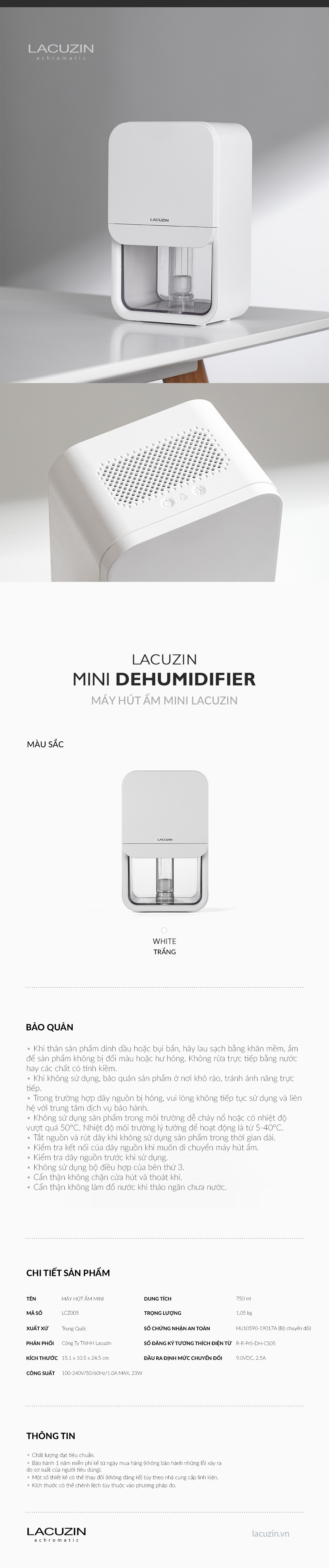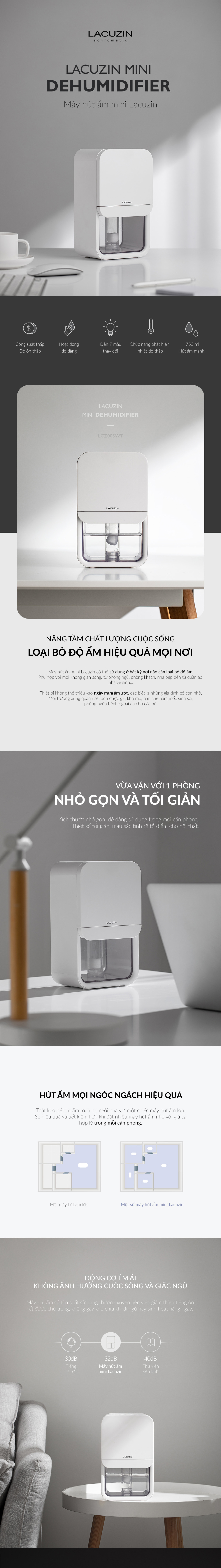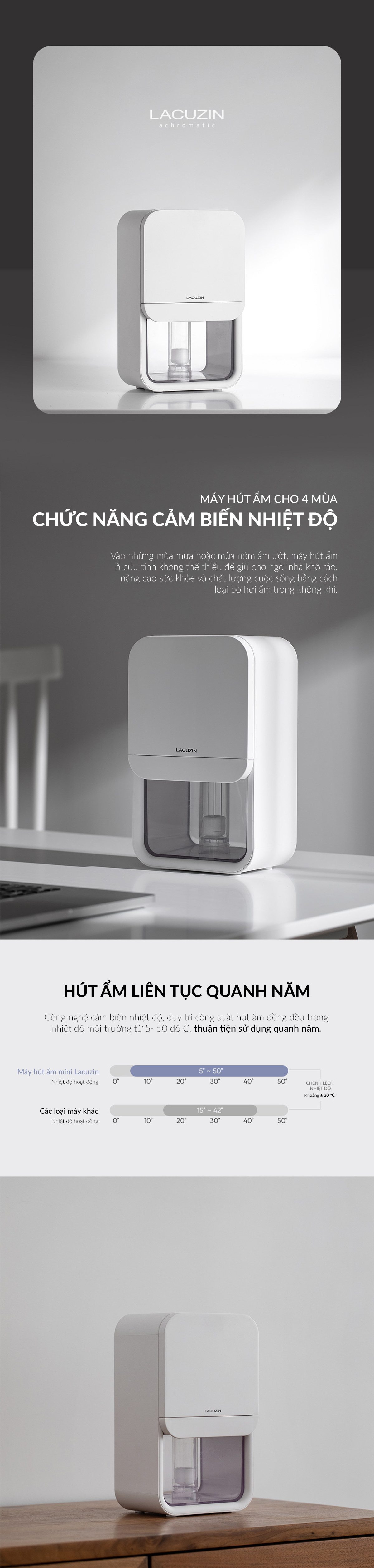 MÁY HÚT ẨM MINI CỦA LACUZIN sẽ giải quyết mọi vấn đề. Giữ ngôi nhà của bạn khô ráo và thoải mái suốt 4 mùa, loại bỏ độ ẩm ở bất kỳ căn phòng nào, từ phòng ngủ, phòng khách, nhà bếp cho đến tủ quần áo, nhà vệ sinh...