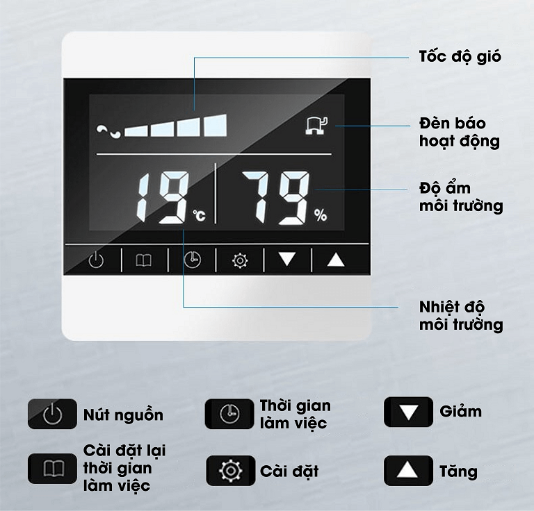 Máy hút ẩm treo trần Kosmen KM-66E trang bị bảng điều khiển kỹ thuật số, có màn hình cảm ứng hiện đại. Bảng điều khiển trực quan hiển thị đầy đủ các thông số về nhiệt độ và độ ẩm trong phòng khi sử dụng. Chỉ cần nhấn vào các nút, các tính năng sẽ được kích hoạt và từ đó bạn có thể theo dõi các hoạt động của máy. Ngoài ra, sản phẩm còn có bộ đếm thời gian để người dùng có thể biết được thời gian sử dụng máy trong ngày, từ đó có thể điều chỉnh theo nhu cầu.