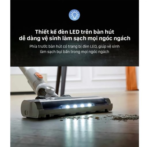 Phía trước đầu hút sàn máy hút bụi không dây Lydsto V9 có trang bị đèn LED, giúp vệ sinh làm sạch bụi bẩn trong mọi ngóc ngách