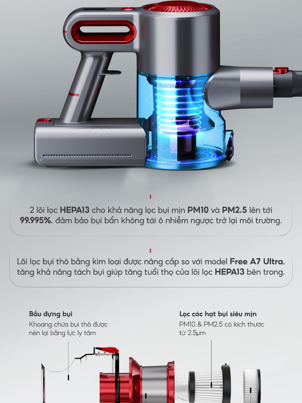Lõi lọc bụi thô bằng kim loại được nâng cấp so với model Free A7 Ultra, tăng khả năng tách bụi, giúp tăng tuổi tho của lõi lọc HEPA 13 bên trong.