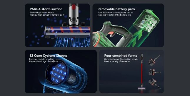 Tính năng của máy hút bụi không dây Lydsto Vacuum Cleaner V10: lực hút. Động cơ không chổi than 350 W tạo ra lực chân không lên đến 25.000 Pa và công suất hút 125 W, đảm bảo kết quả làm sạch cao và ổn định.