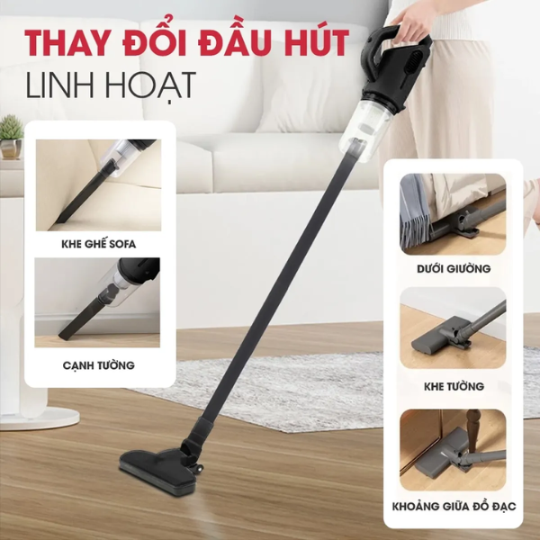 Sản phẩm đi kèm bộ đầu hút đa năng, giúp người dùng linh hoạt làm sạch nhiều khu vực khác nhau như khe hẹp, góc bàn, sofa, giường nệm, màn cửa hay bàn phím máy tính. Dây điện dài 5m mang đến sự thuận tiện, giảm nhu cầu thay đổi ổ cắm liên tục khi di chuyển trong phòng.