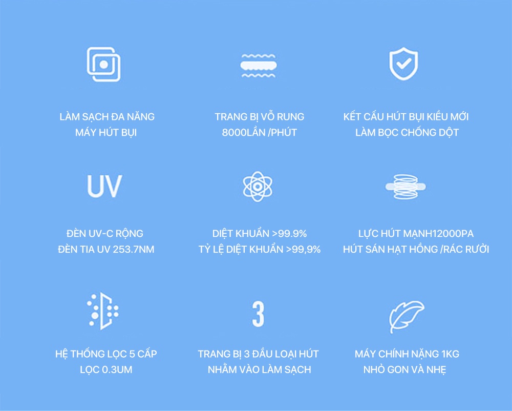 - Lực hút đạt 12.000 Pa, hút mạnh mẽ Áp dụng công nghệ UV-C giúp diệt khuẩn hiệu quả trong buồng hút
