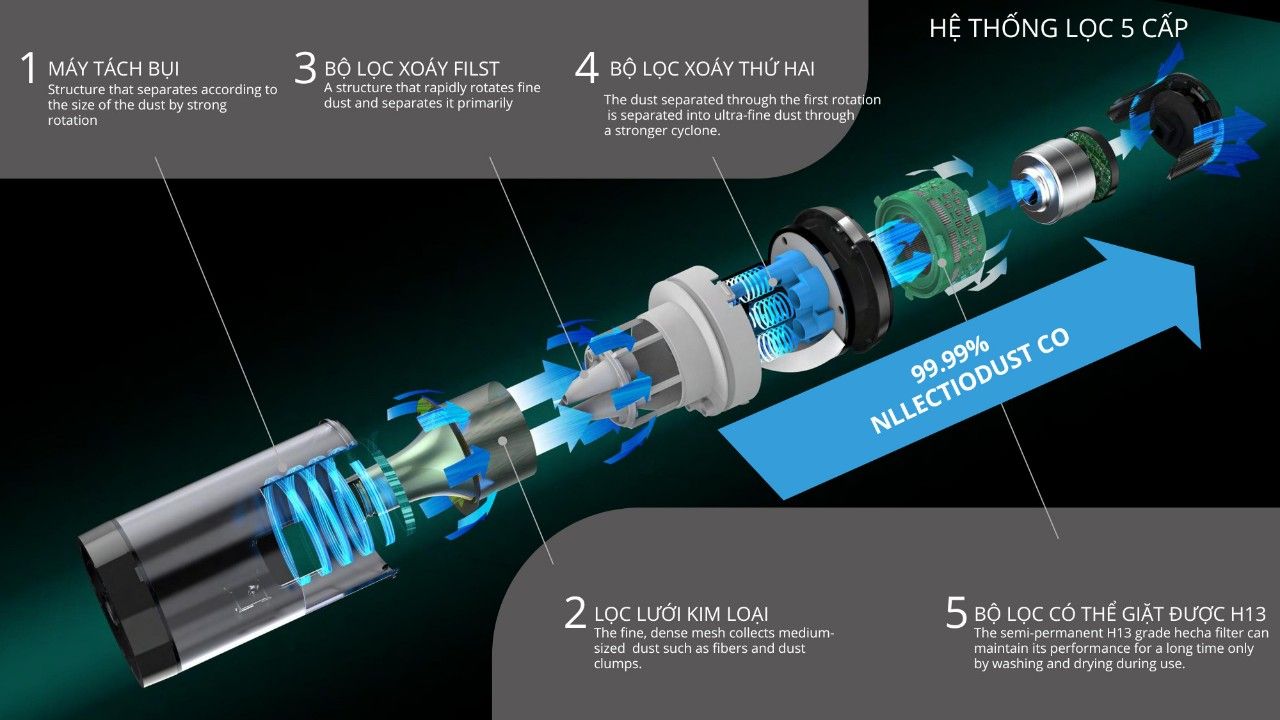 - Hệ thống lọc đa lớp lọc 99.999% bụi siêu mịn