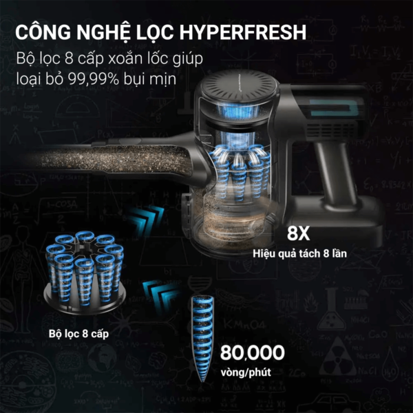 Đồng thời, máy còn tích hợp công nghệ Lọc HyperFresh với 8 cấp xoắn lốc, giúp loại bỏ mọi loại bụi bẩn, từ những hạt nhỏ li ti đến các chất gây dị ứng. Nhờ công nghệ này, Rowanto V25 không chỉ làm sạch bề mặt mà còn giúp lọc sạch không khí trong nhà, mang lại một không gian sống trong lành và dễ chịu.