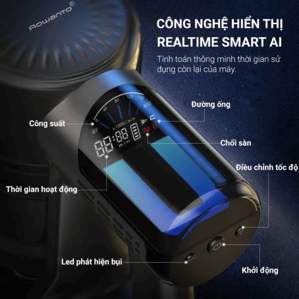 Một trong những điểm độc đáo của máy hút bụi Rowanto V25 chính là tính năng Realtime Smart AI – công nghệ trí tuệ nhân tạo giúp tính toán thông minh thời gian sử dụng còn lại của máy. Tính năng này cho phép bạn biết chính xác khi nào máy cần được sạc, giúp bạn có kế hoạch dọn dẹp một cách hợp lý và hiệu quả hơn.