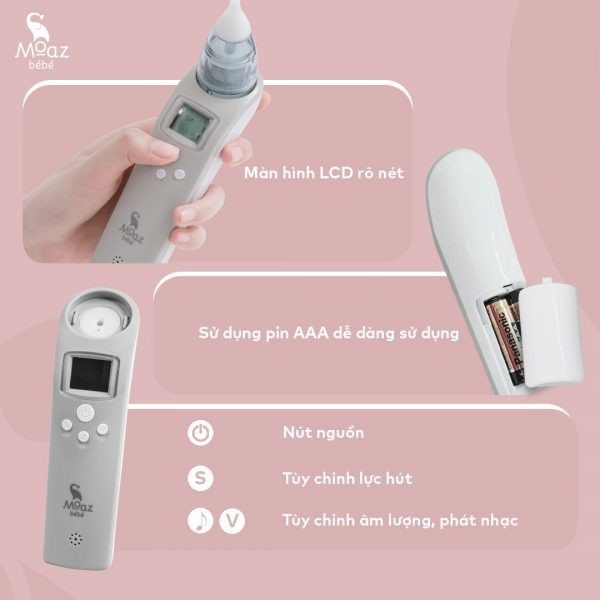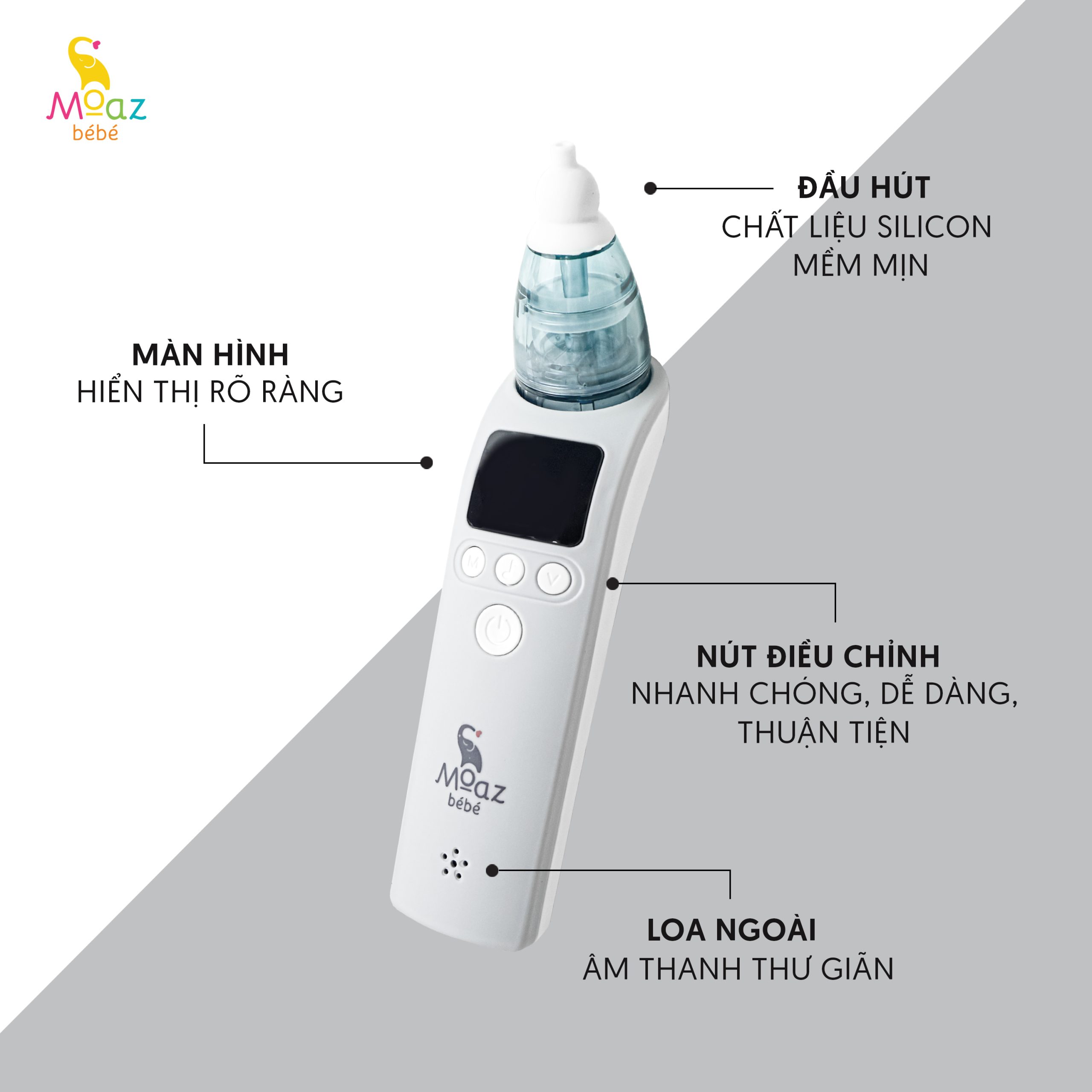 Máy hút mũi MB – 010 Moaz BéBé hỗ trợ hút dịch đờm ra khỏi khoang mũi của trẻ, tạo sự thông thoáng đường thở, giúp trẻ phục hồi lại hệ hô hấp nhanh chóng, an toàn, sạch sẽ. Máy có 2 đầu hút để hút dịch nhày và dịch lỏng, với khả năng điều chỉnh lực hút mạnh nhẹ giúp tránh tổn thương niêm mạc mũi. Ngoài ra, sản phẩm còn tích hợp chế độ nhạc giúp bé thư giãn khi hút mũi.