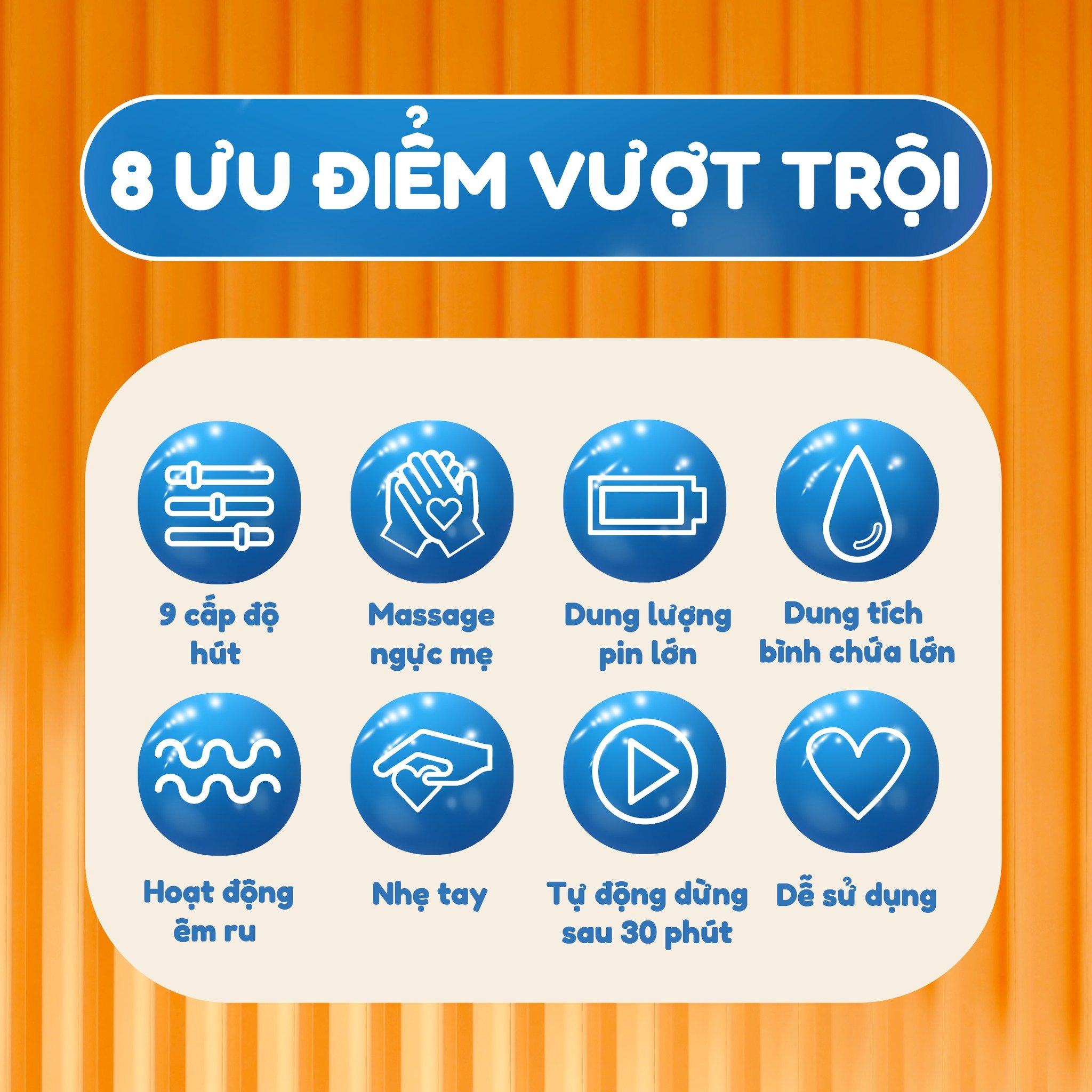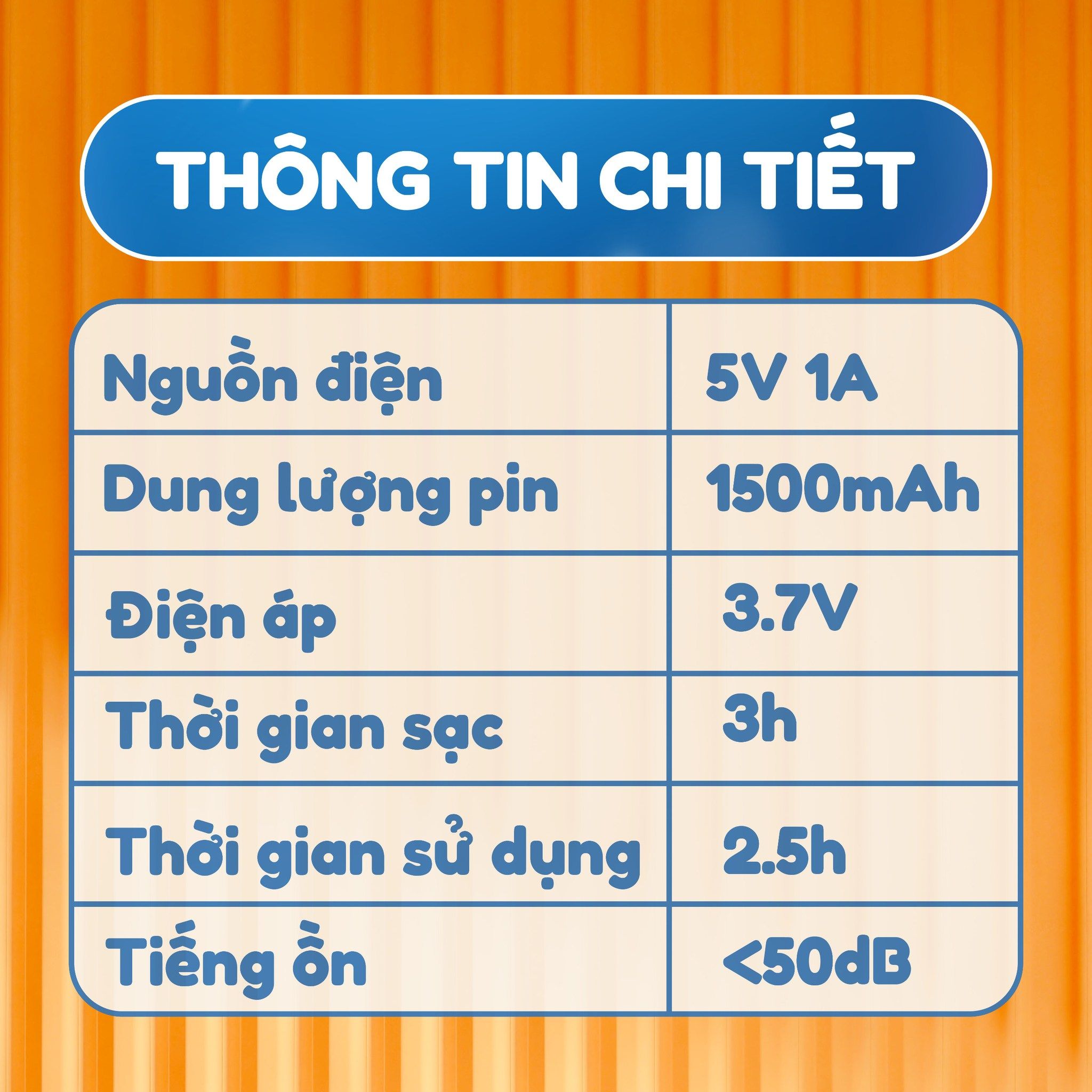 Máy được trang bị pin sạc dung lượng cao, cho phép sử dụng liên tục trong nhiều giờ mà không cần lo lắng về việc sạc pin thường xuyên. Điều này rất tiện lợi cho các mẹ bận rộn hoặc khi đi ra ngoài.