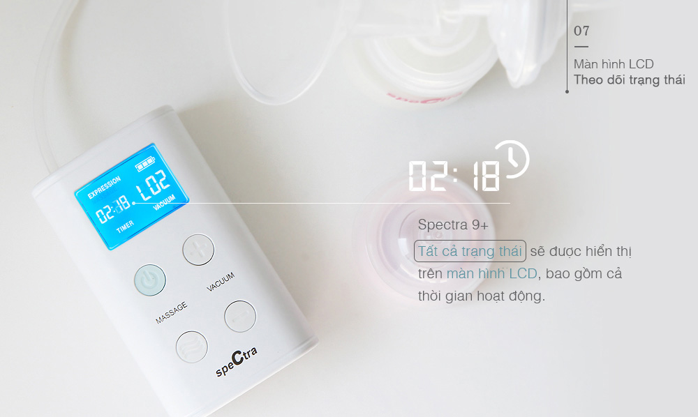 Được trang bị màn hình LCD hiển thị bằng ký hiệu và số đầy đủ các chế độ hút/massage, chu kỳ hút, thời gian hút/massage cũng như dung lượng pin còn lại, máy hút sữa Spectra 9+ chắc chắn có thể tối ưu hóa sự tiện lợi cho mẹ khi thao tác hút sữa. Màn hình LCD hiển thị rõ nét với độ tương phản cao nên dù đang ở vị trí không thể nhìn trực tiếp vào đó, mẹ vẫn có thể theo dõi những thông số chính xác nhất chỉ với một cái liếc nhìn.