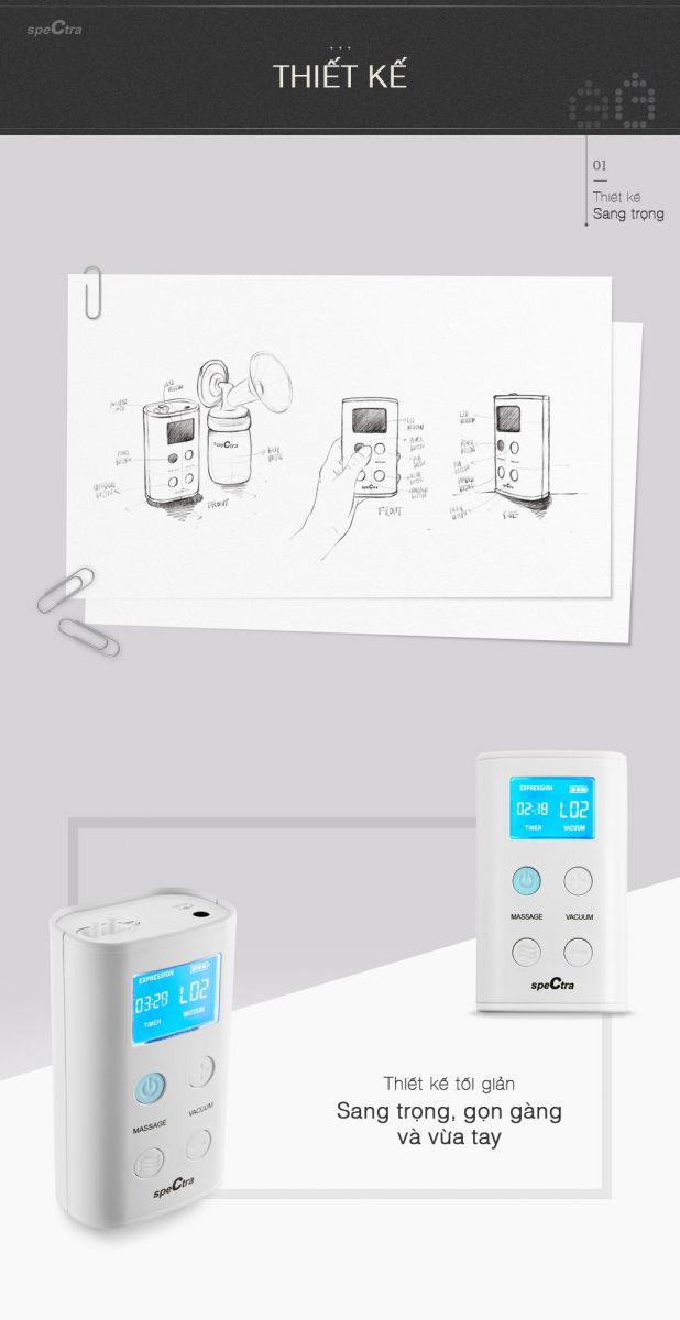 Phần thiết kế của Máy hút sữa Spectra 9+ cũng rất được chú trọng từ khi còn nằm trên bản vẽ sơ khai nhất, vì việc hình dáng của máy ra sao để có thể mang đến sự thoải mái khi cầm trên tay, cũng như gợi lên sự hợp mắt, tạo tâm lý vui vẻ cho người mẹ là rất quan trọng đối với chúng tôi.