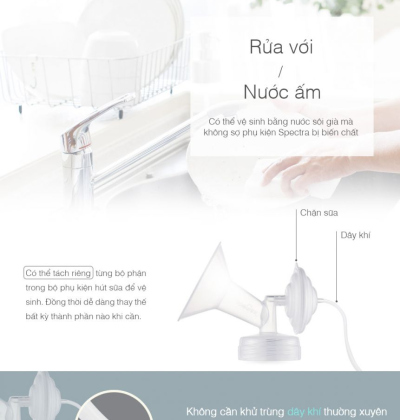 Vệ sinh phụ kiện bằng nước rửa bình sữa chuyên dụng hoặc nước ấm/ nước sôi già. Tránh đun sôi trực tiếp phụ kiện vì về lâu dài có thể làm dãn nở hoặc biến dạng, khiến cho các khớp nối bị lỏng làm giảm hiệu quả hút sữa.