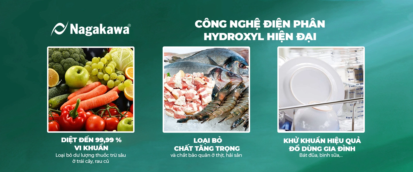 Điện phân Hydroxyl là công nghệ khử khuẩn tiên tiến hiện nay, có khả năng làm sạch thực phẩm theo cơ chế thông minh: