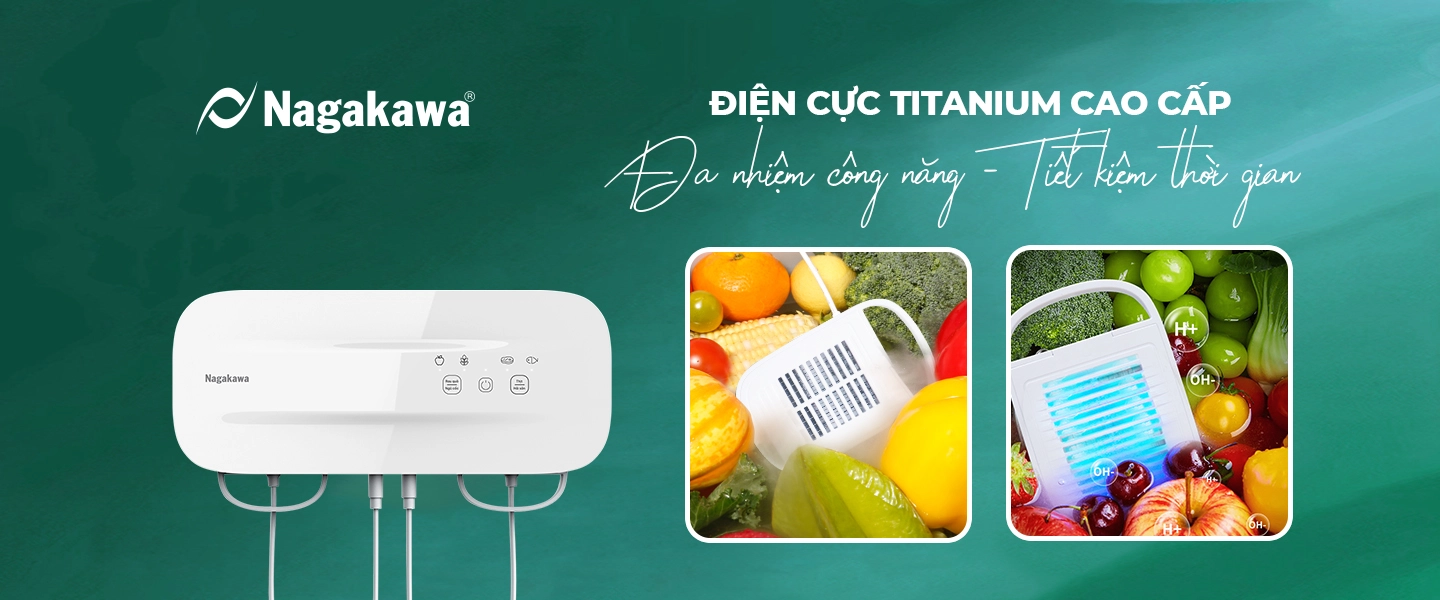 - Hai điện cực Titanium cao cấp siêu bền giúp khử khuẩn song song nhiều loại thực phẩm, tiết kiệm thời gian;