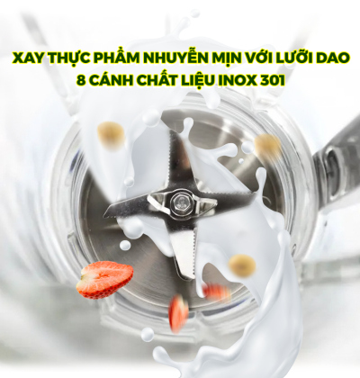 Với chất liệu Inox 301 (cải tiến từ inox 304), kết hợp cùng lưỡi dao 8 cánh (4 cánh chính, 2 cánh phụ lớn bên dưới và 2 cánh phụ nhỏ bên trên) cực sắc bén giúp xay nhuyễn mịn tất cả các thực phẩm từ mềm đến cứng mà không cần phải xay hay lọc nhiều lần như: các loại hạt, trái cây, rau củ đến đá viên.