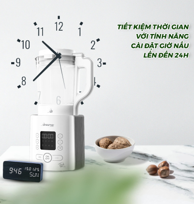 Cài đặt trước thời gian nấu đến 24h siêu tiện lợi. Bạn chỉ cần hẹn giờ trướcvà chọn chức năng, cho nguyên liệu vào máy. Vào đúng thời điểm được cài đặt, bạn sẽ có ngay những ly sữa hạt cực kỳ thơm ngon, bổ dưỡng. Tính năng hẹn giờ này đặc biệt phù hợp cho những nguyên liệu cứng, cần ngâm trước khi chế biến.