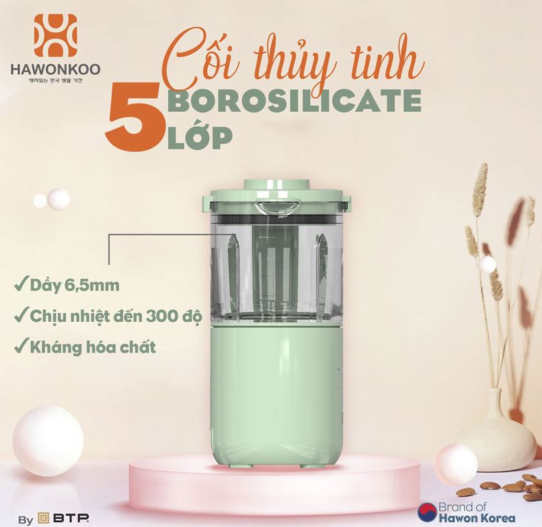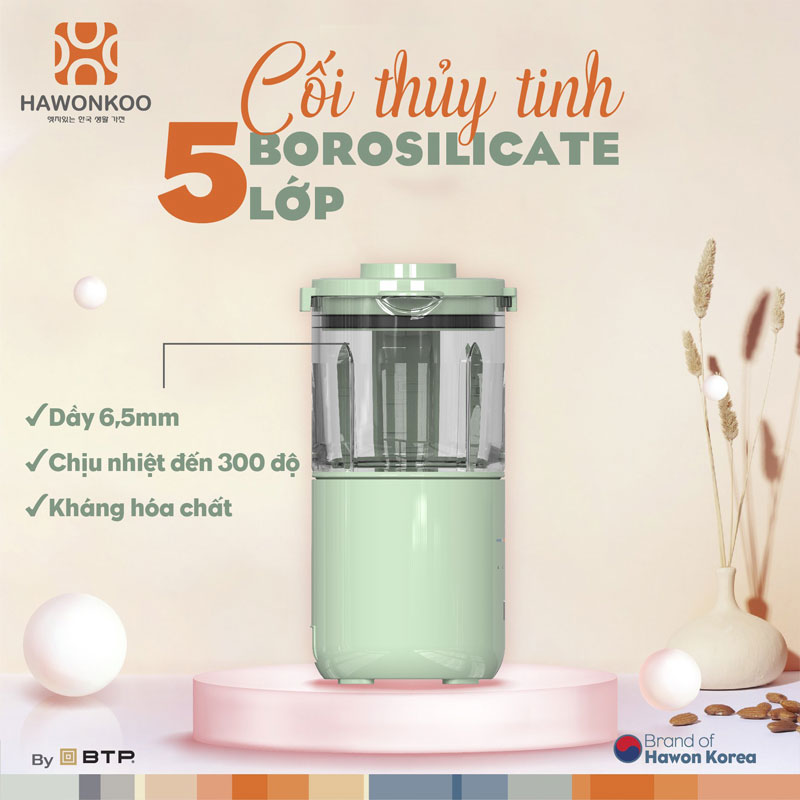 - Các thành phần không chứa chất gây ung thư “PFOA” với inox 304, Thủy tinh Borosilicate 5 lớp, nhựa ABS không chứa chất độc hại cho sức khỏe, độ bền cao, hạn chế bám bẩn và dễ vệ sinh.