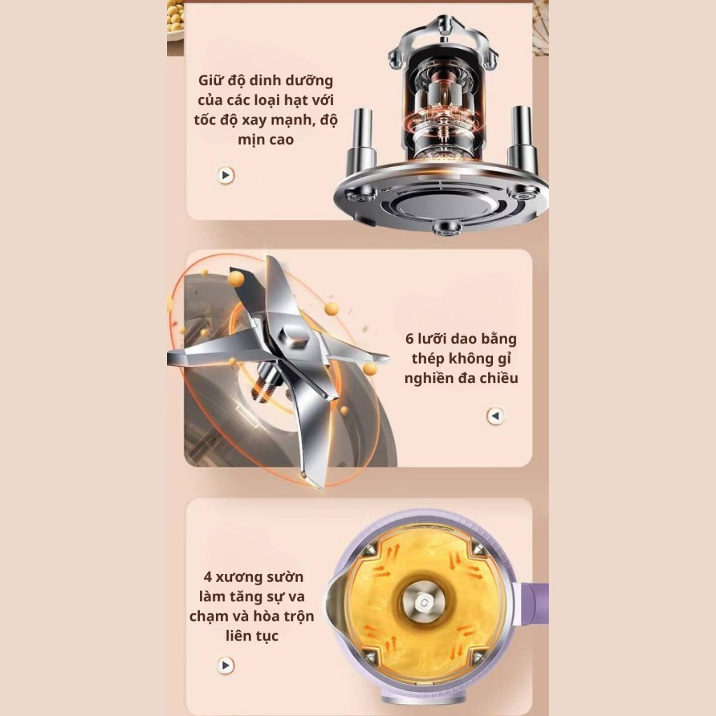 Lưỡi dao 6 lưỡi bằng inox 304 bền chắc: giúp xay nhuyễn mọi loại hạt nhanh chóng dù là có hay không ngâm giúp thành phẩm sữa thơm ngon và nhuyễn mịn hơn