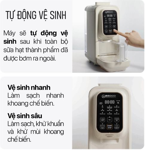 - Chế độ Tự Vệ Sinh hiệu quả, không cần vệ sinh lại bằng tay, máy tự khử trùng bằng hơi nóng sau khi nấu