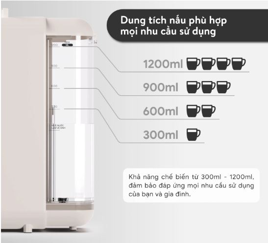 + Tự động bơm nước chính xác và nấu theo dung tích cài đặt (300ml/600ml/900ml/1200ml)