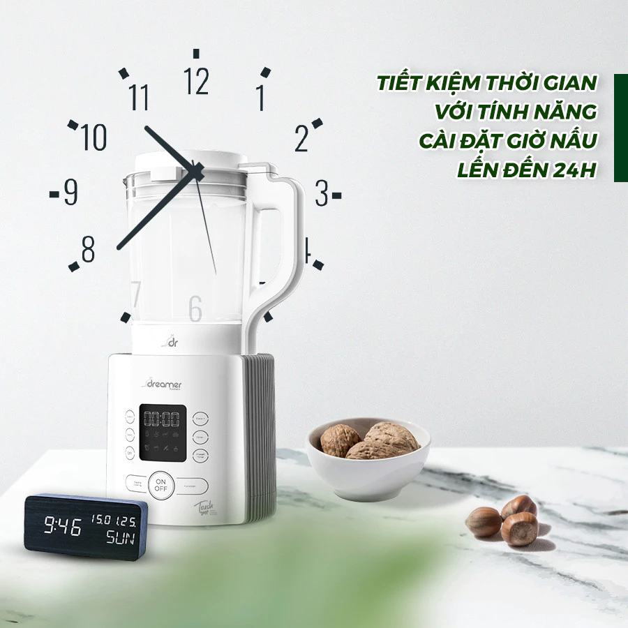 - Máy xay nấu đa năng Dreamer được thiết kế thêm tính năng cài đặt trước thời gian nấu đến 24h, bạn chỉ cần hẹn giờ, chọn chức năng và cho nguyên liệu vào máy. Vào đúng thời điểm được cài đặt, bạn sẽ có ngay những ly sữa hạt cực kỳ thơm ngon, bổ dưỡng.
