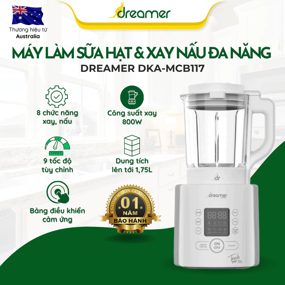 - Máy xay nấu đa năng Dreamer có 8 chức năng được cài sẵn thời gian, chế độ xay, nấu gồm: Sữa hạt, làm xốt, cháo, soup đặc, sinh tố, nước ép trái cây & rau củ, các món xay nấu tùy chỉnh
